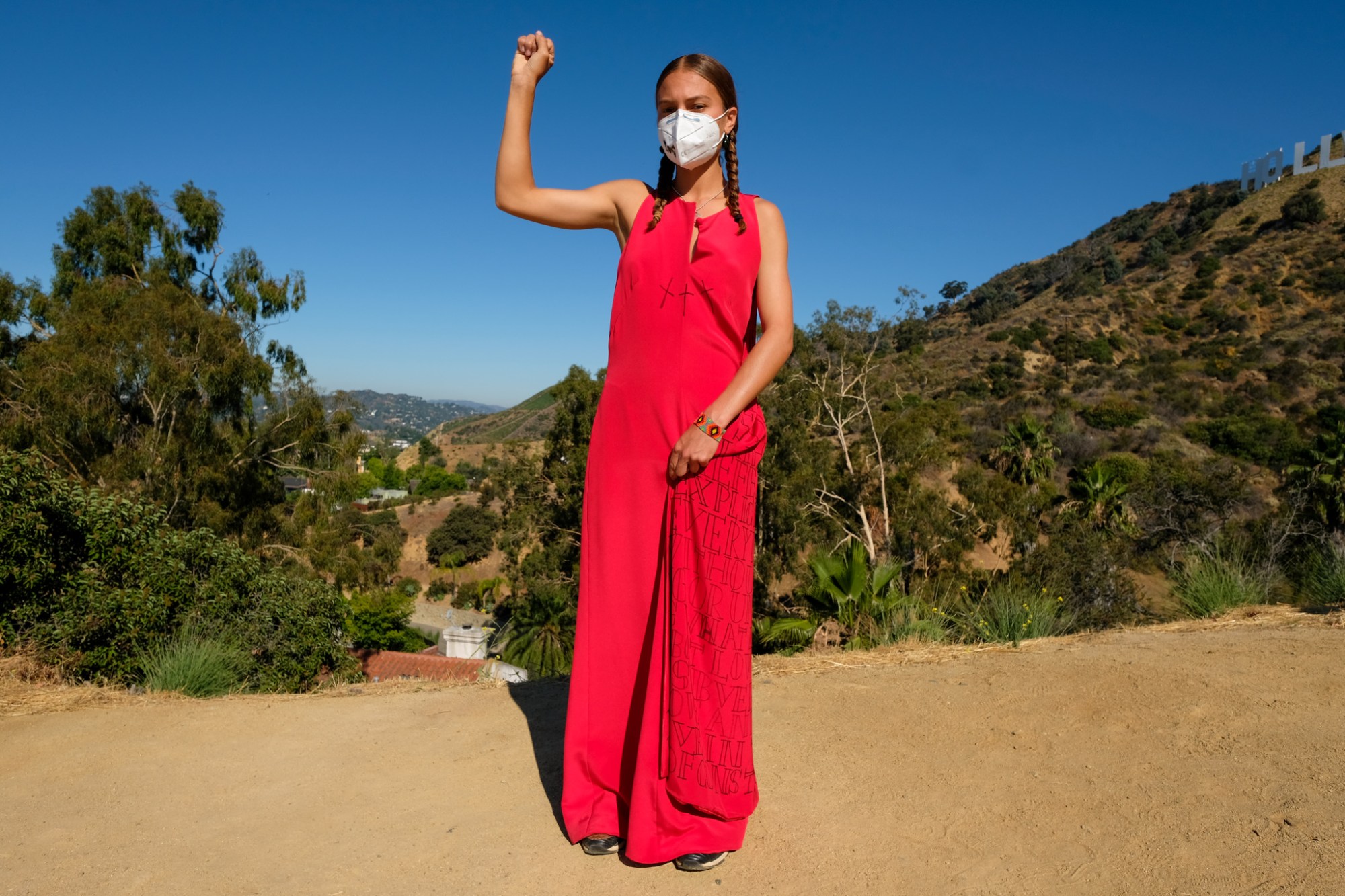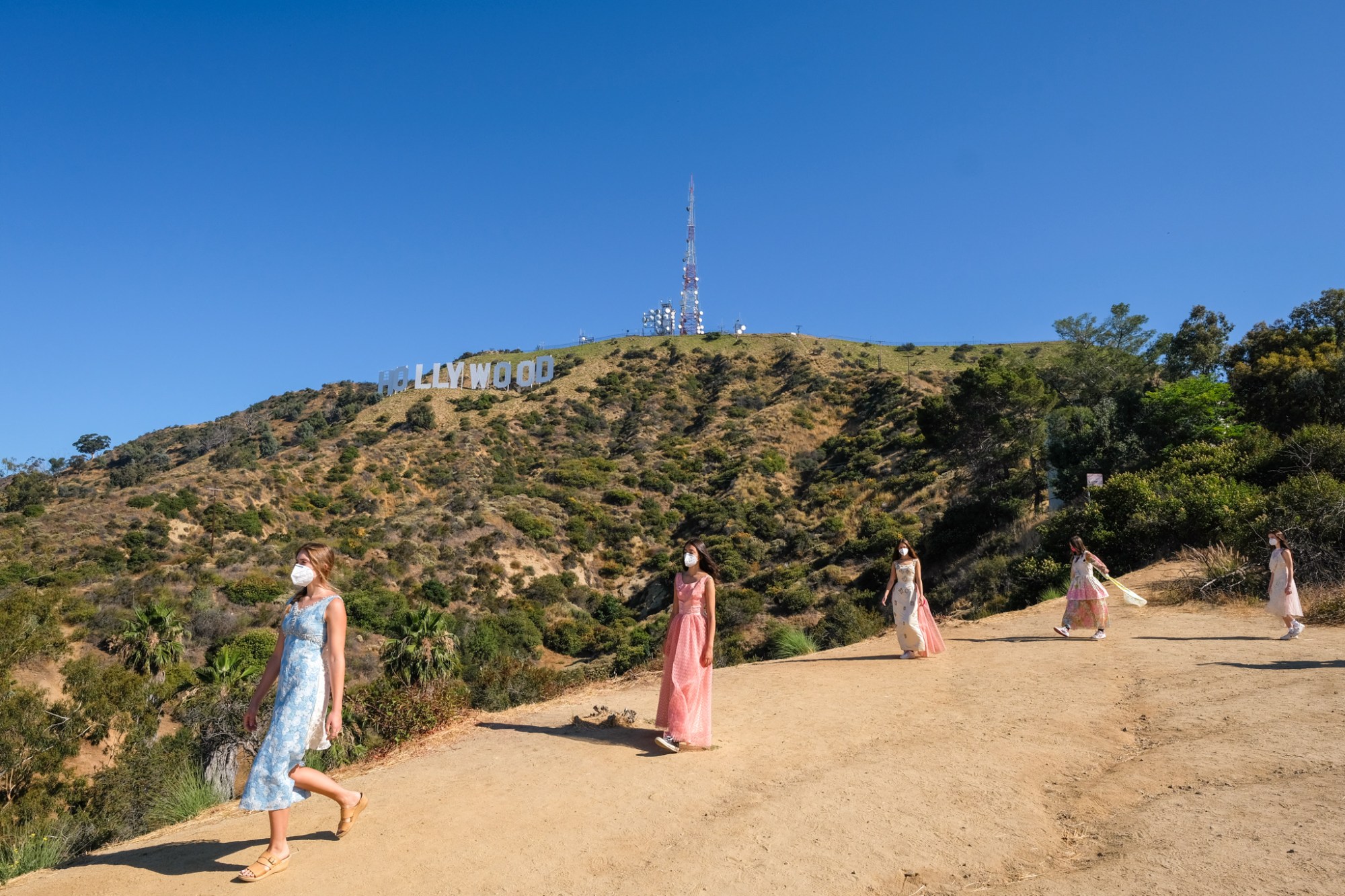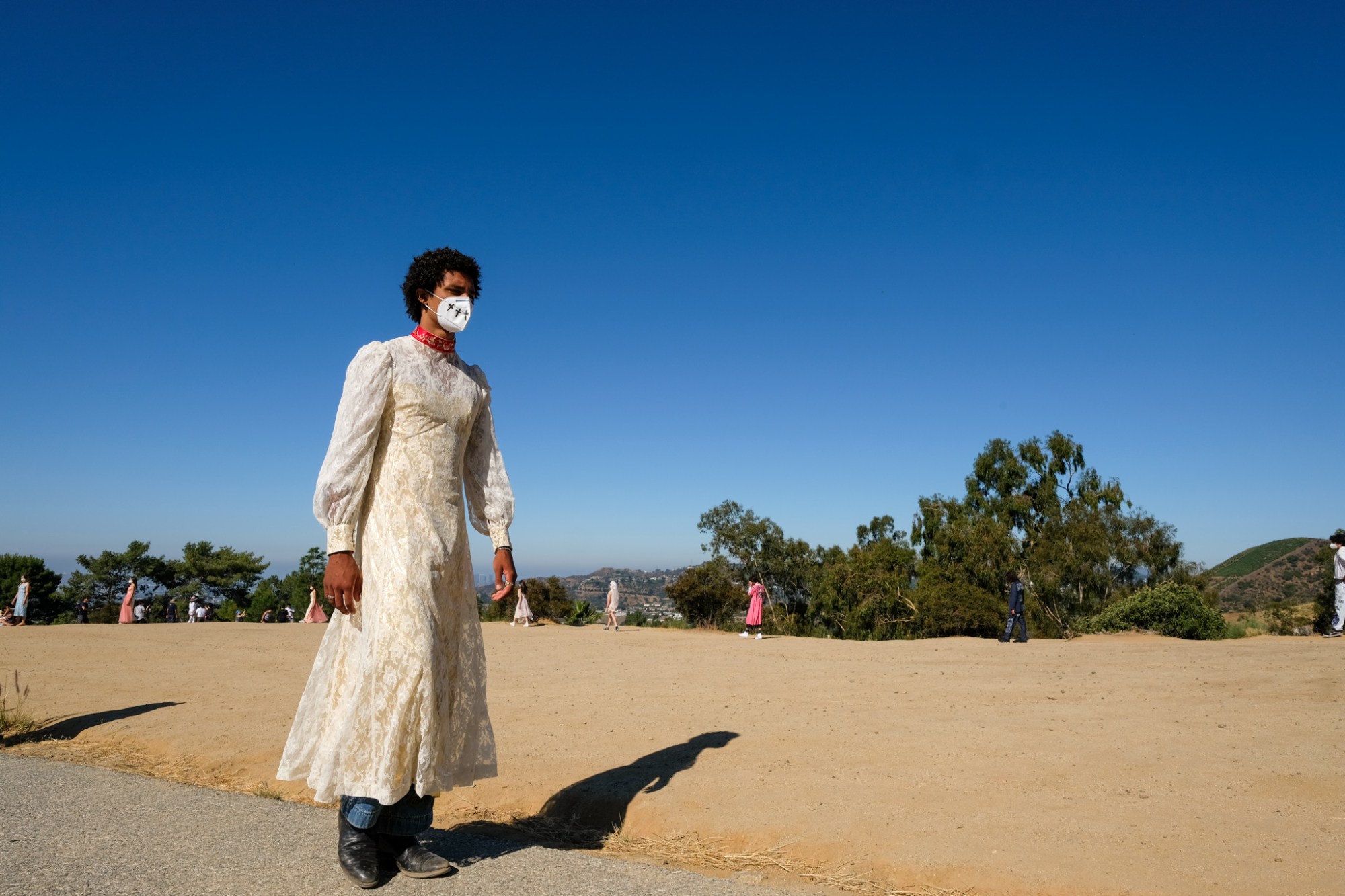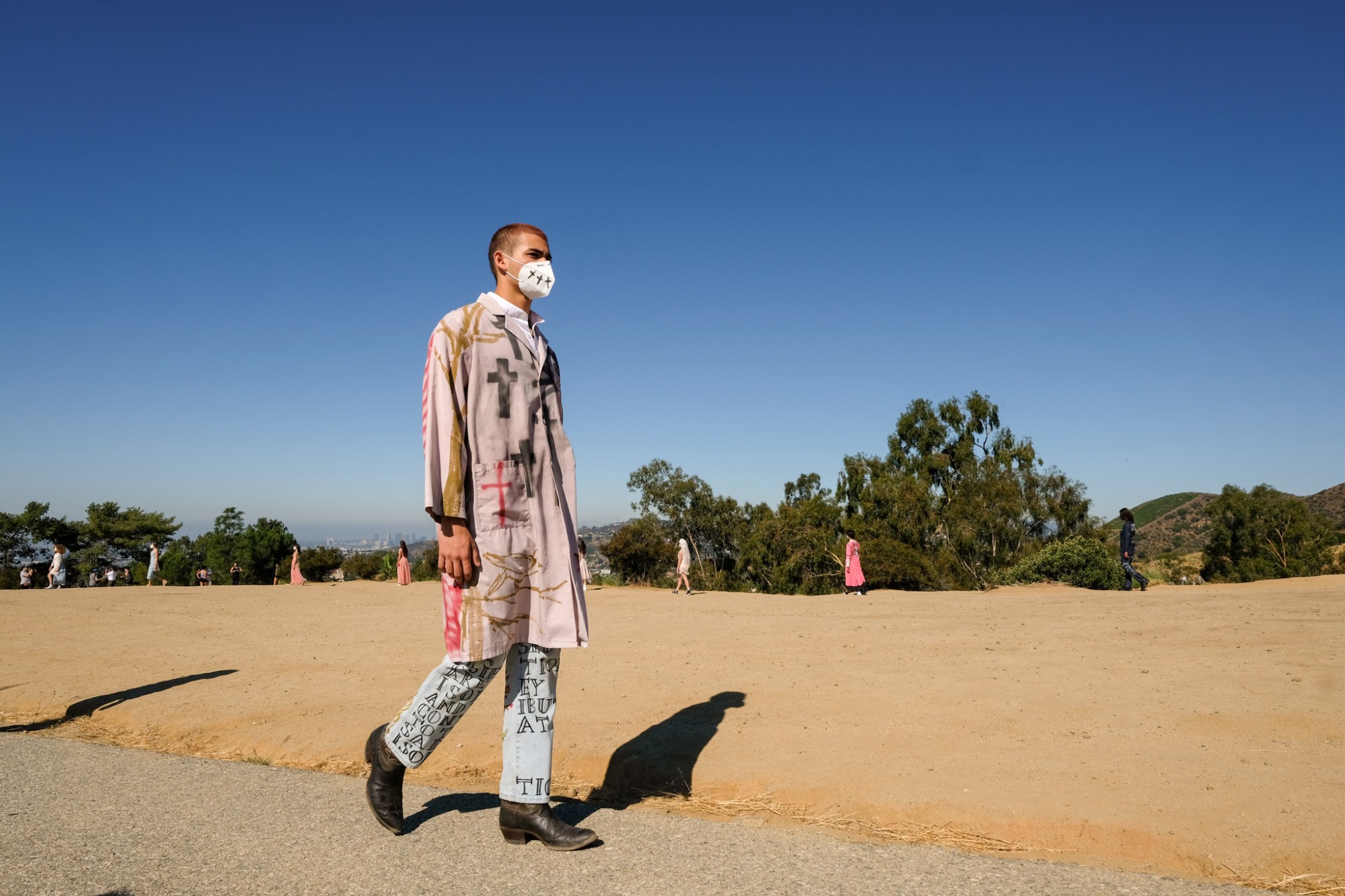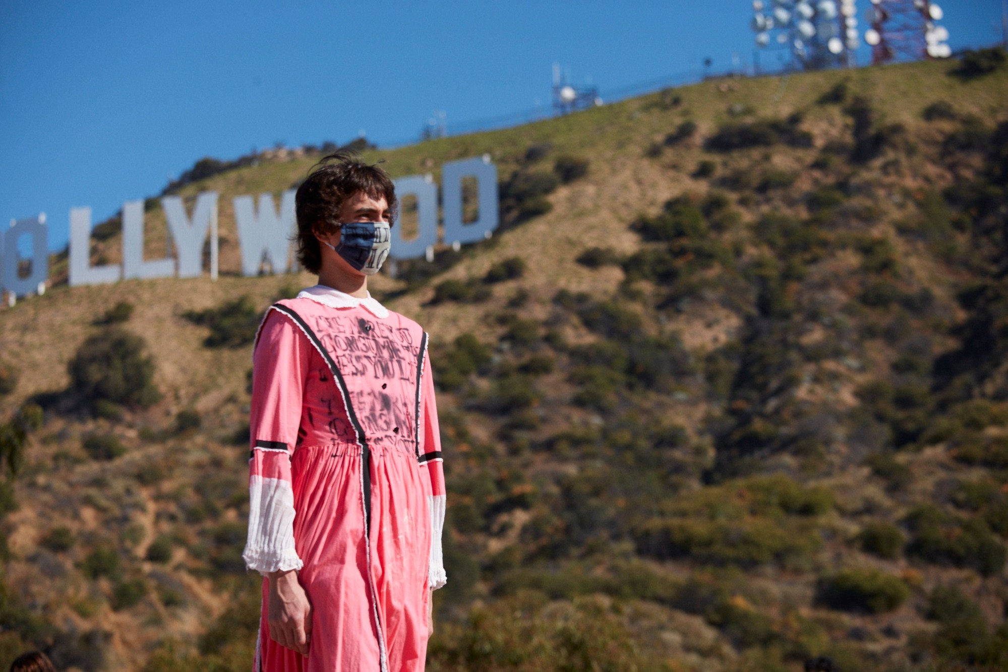 Twenty years after its inception, Imitation of Christ has risen once again. The resurrection of the eco-political, art slash fashion label was inaugurated, naturally, by a protest-cum-fashion-show, held guerilla style under the sweltering heat of the Fourth of July and the shadow of the Hollywood sign. Both the date and location of the event were no coincidence. Spurred by the precarity and urgency of the current moment, around the world and especially in America, the second coming of Imitation of Christ — as with the first — aims to disrupt the status quo and to affect real social change, all in the label’s signature grassroots, sartorially-inclined way.