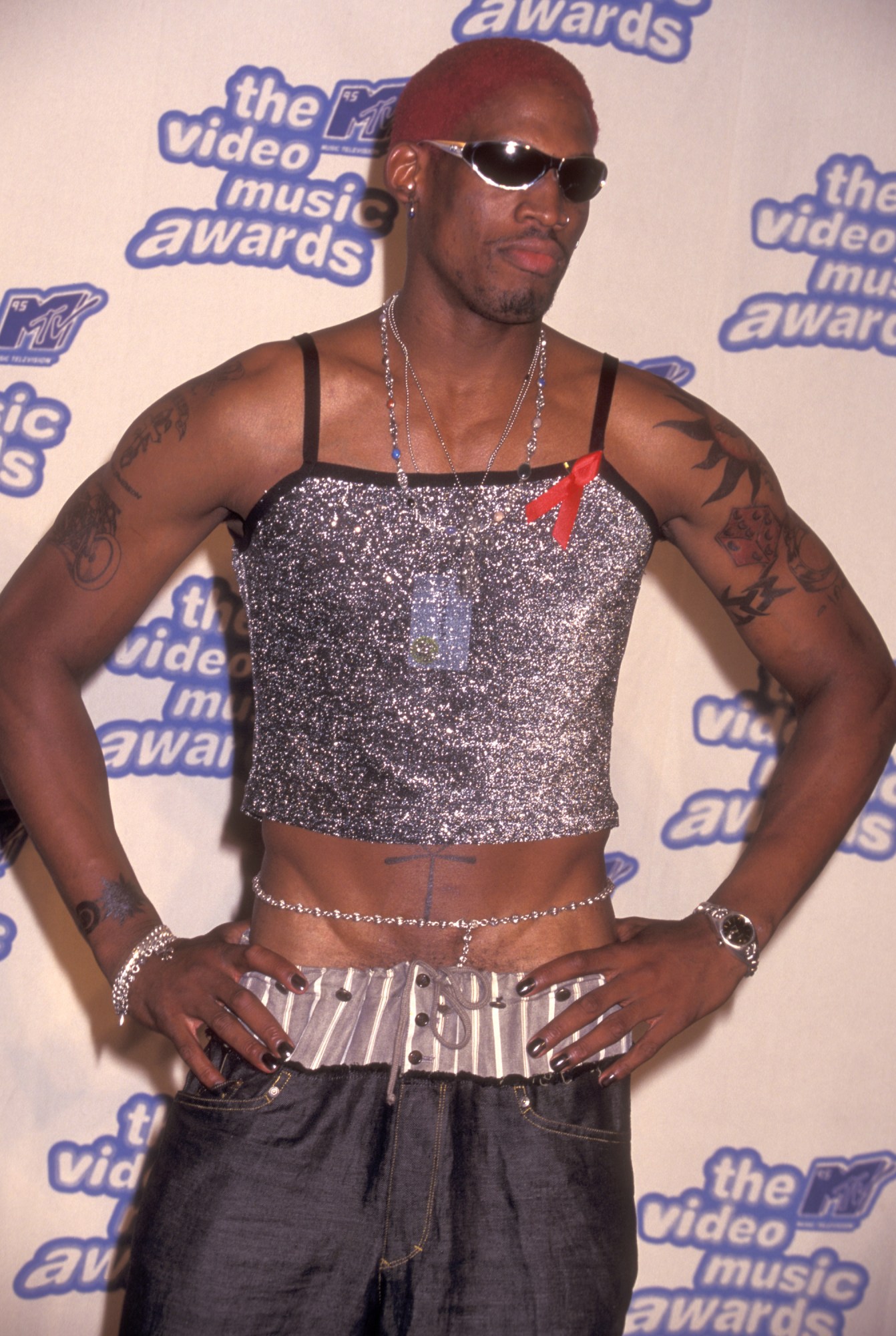 Rodman’s open acceptance of the LGBTQ community was something never seen before in the straight-laced NBA. He was often spotted partying with friends at gay bars during his time at San Antonio, and began experimenting with drag looks, which he later explained in his autobiography had been a part of his life since he was a young boy. After claims that Dennis was manipulating the LGBTQ lifestyle for shock value to raise his profile, he used his appearance at the MTV VMA awards as an opportunity to clapback, by slipping into this sensational sequin vest paired with a red ribbon in support of AIDS awareness.