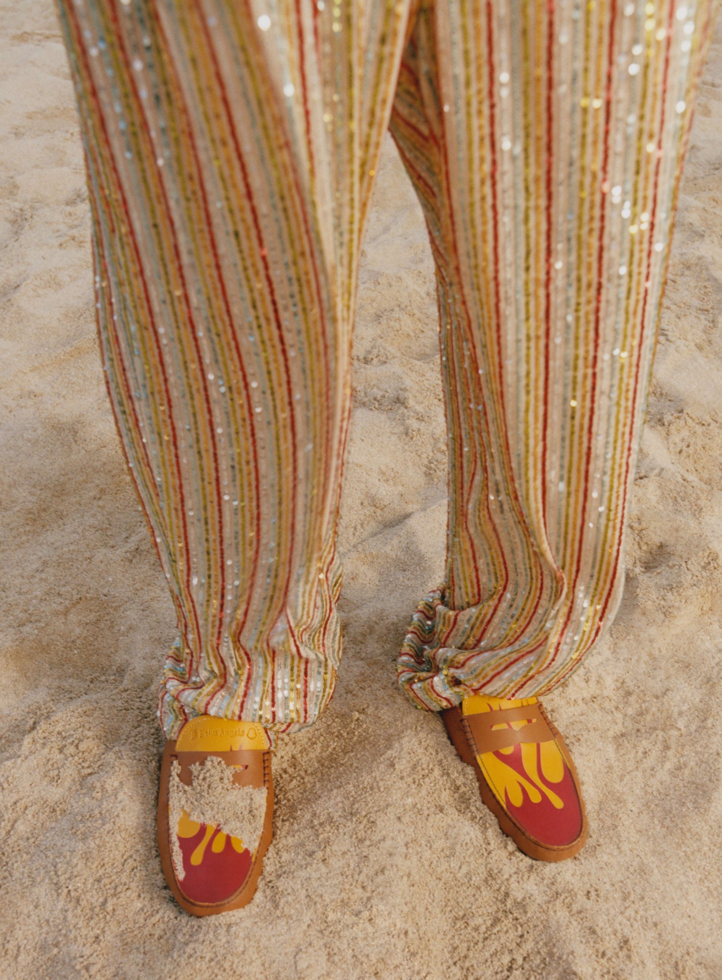 a close up of a models shiny beaded trousers and flame-painted deck shoes standing on a beach
