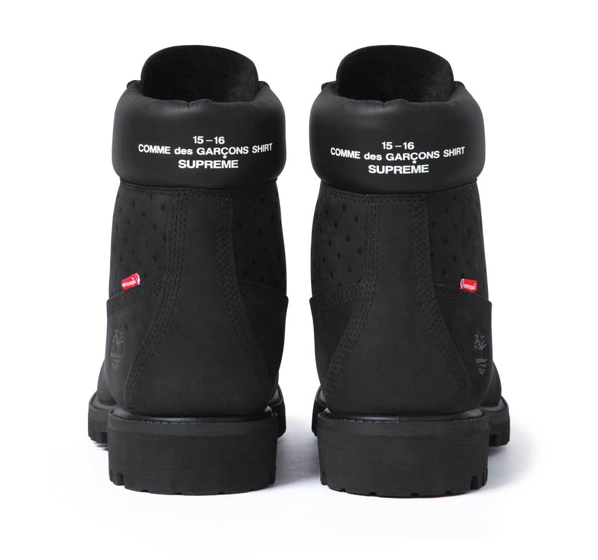 Supreme have outdone themselves, heading up a three-way collaboration that sees them working on two pairs of boots with Comme des Garçons SHIRT and Timberland. The classic 6-Inch Premium Waterproof Boot gets a reworking with a dotted embossed pattern and Comme font on the padded leather at the back.