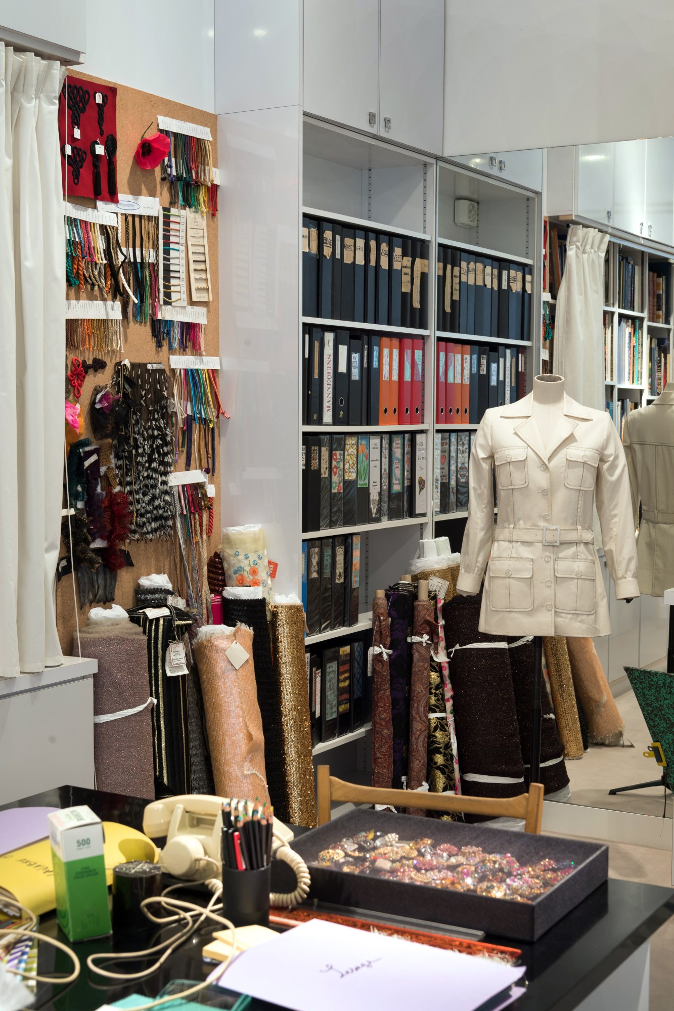 The intention of the museum is to show how a couture and ready-to-wear house worked at the end of the 20th century. You can watch films with the key players of his universe discussing the shows, the relationship with the press, the sales process. Lavish examples of embroidery and costume jewelry are on display. And most compellingly, Saint Laurent’s entire inner sanctum, his private office and atelier, is set up exactly the way he left it upon retiring in 2002. So there is the dog bowl that his succession of dogs named Moujik drank from. A Rolodex turned to “Lemarie Plumier,” a particularly prized feather-worker. His tortoiseshell glasses. Parisians love this technique of creating a perfect postmortem mise-en-scene (see also: Coco Chanel’s apartment, Brancusi’s workspace). It’s like: he’s still here, you might be able to smell a whiff of création!