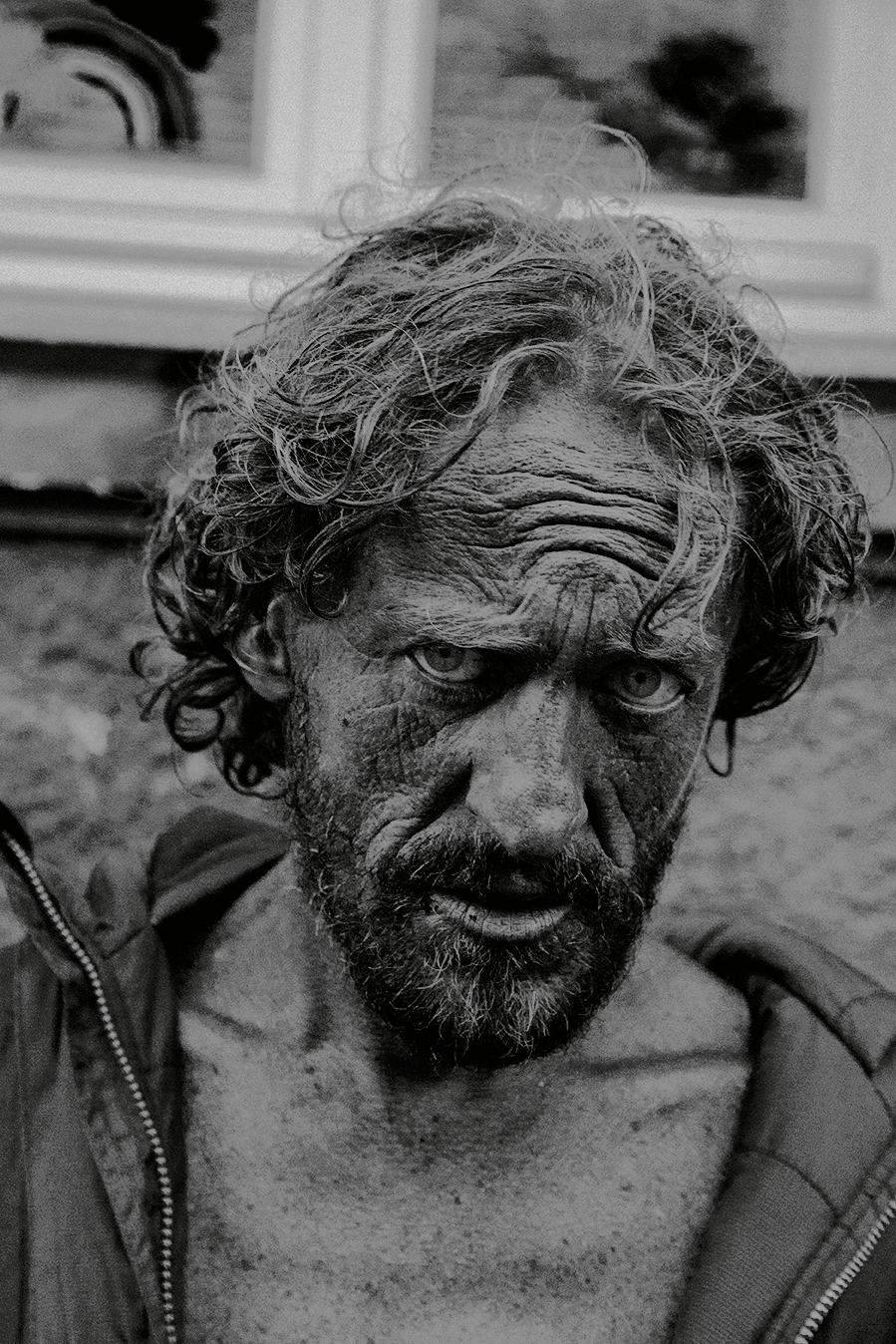 She was wonderful, keeping him off the streets and away from alcohol (he started drinking at 14 and was completely addicted by 18). He had been sober for a while since he began treatment. But one night, he said to himself, “Just one drink.” Of course, that one sip of alcohol got him right back into the rut. Out of nowhere, Bobby began selling all of his punk clothing in order to feed his addiction. He said to me, “every time she pops into my head, I push her away and I try to think of another thought; I don’t want to think about her, so my mind focuses on the alcohol instead.” It hurts me to even talk about this. The saddest part is that every time I see him, he can’t remember my face: it’s as if his mind presses “restart” when he blanks out. It’s the same stories, same everything. He always says, “you’re the only one that actually sits down with me and has a full conversation with me.” Last time I saw him—feces oozing out of the bottom and back of his pants—he told me, “I got a habit, I got to feed it: it’s calling me, it’s in my brain, it’s screaming ‘Bobby, come get me,’ and I’m going to get her.” As he stands, a visible stain is left on cement from his excrement. He begins crying: “I want to call her… I love her with all my heart: she means everything in the world to me. She’s always stood by me. That’s my girl. I don’t like to talk about it, it gets me stupid. You should’ve never brought her up.” Thinking I was going to shoot up with him, he warned, “You’re not using my needle though—you have to get two sets. I’m not letting you use my needle. I have The Virus, you know.”
