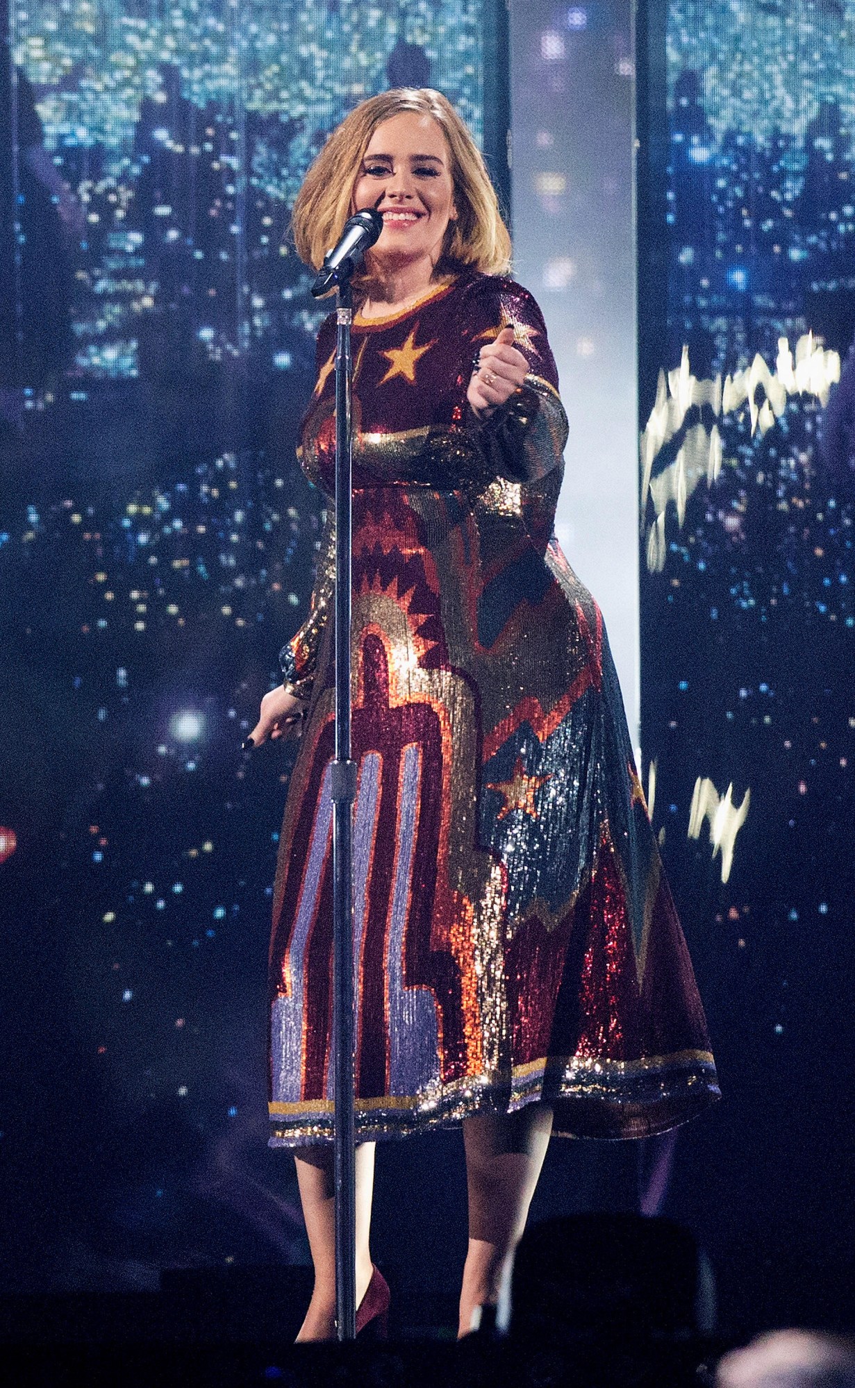 adele in a sequinned dress performing at the brit awards in 2016