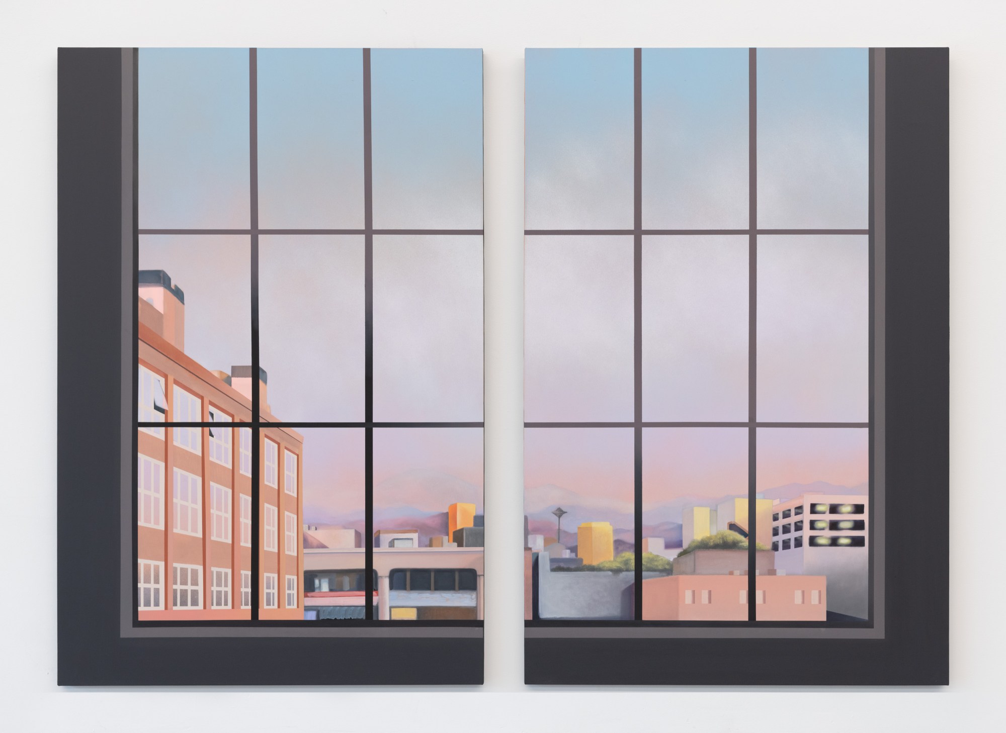 The unequivocal qualities of each city spark tension and reveal something of the inner world of the artist, appearing as a simulacrum of the psychological states affiliated with queer life. In “Studio, Golden Hour (Downtown Los Angeles)” and “Studio, Gray Day (FiDi, NYC)”, the artist presents two empty spaces – a pseudo-self-portrait that they tell us “feels peaceful and meditative”. A small, stifling New York studio with an arched window evokes psychological compression. While in the contrasting diptych of Alannah’s LA studio with views toward the San Gabriel mountains, the scene evokes feelings of emergence and openness. These paintings depict more than a moment but rather the gravity of time itself unfurling before our eyes.