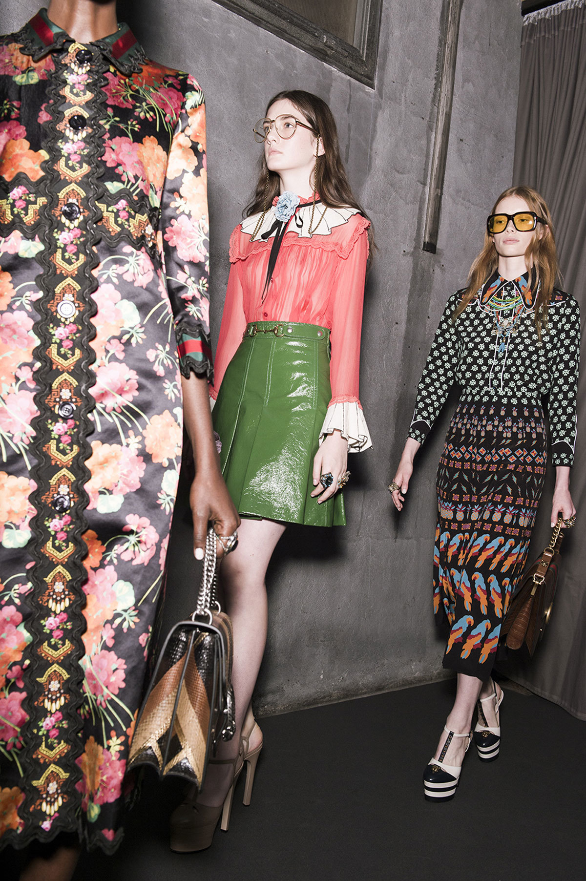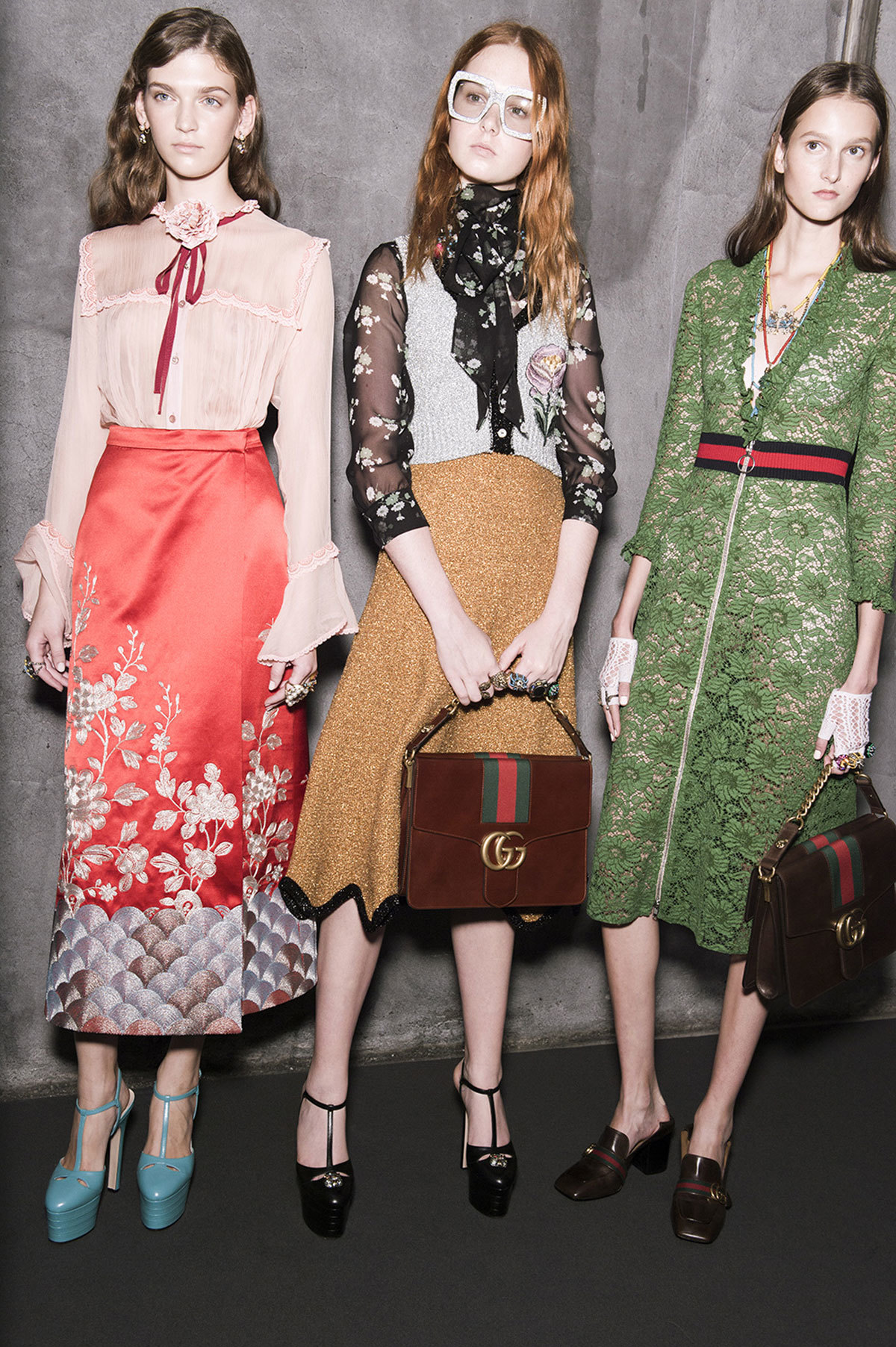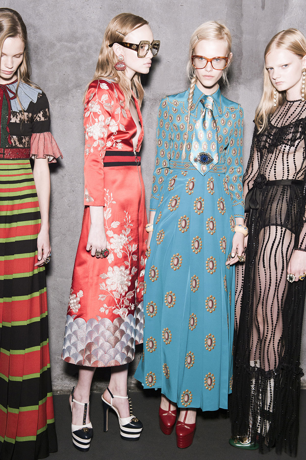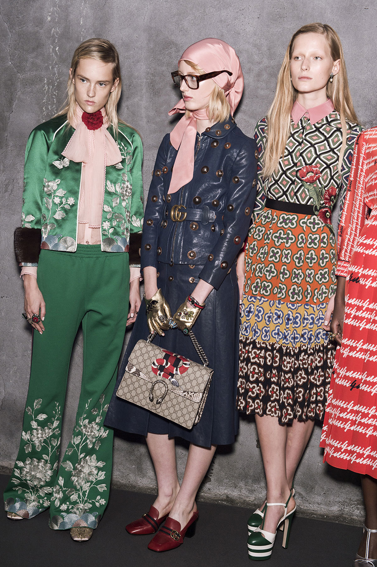 If you want to know what success looks like, compare last season’s backstage situation at Gucci to the one this season. The small group of journalists, who had gone back to speak to Alessandro Michele after his first women’s show in February, suddenly found ourselves outnumbered by the showbiz machine six months on. Dakota Johnson, Alexa Chung, and Kering queen Selma Hayek-Pinault, all getting their fifteen, well, seconds with the new Prince of Milan. In the course of a season, Michele has created a fantasy world so strong at Gucci, you’d think he’d been dreaming about it his whole life—and it isn’t of course unthinkable that during his 15 years at the house, thoughts of conquering the kingdom one day did cross his mind.