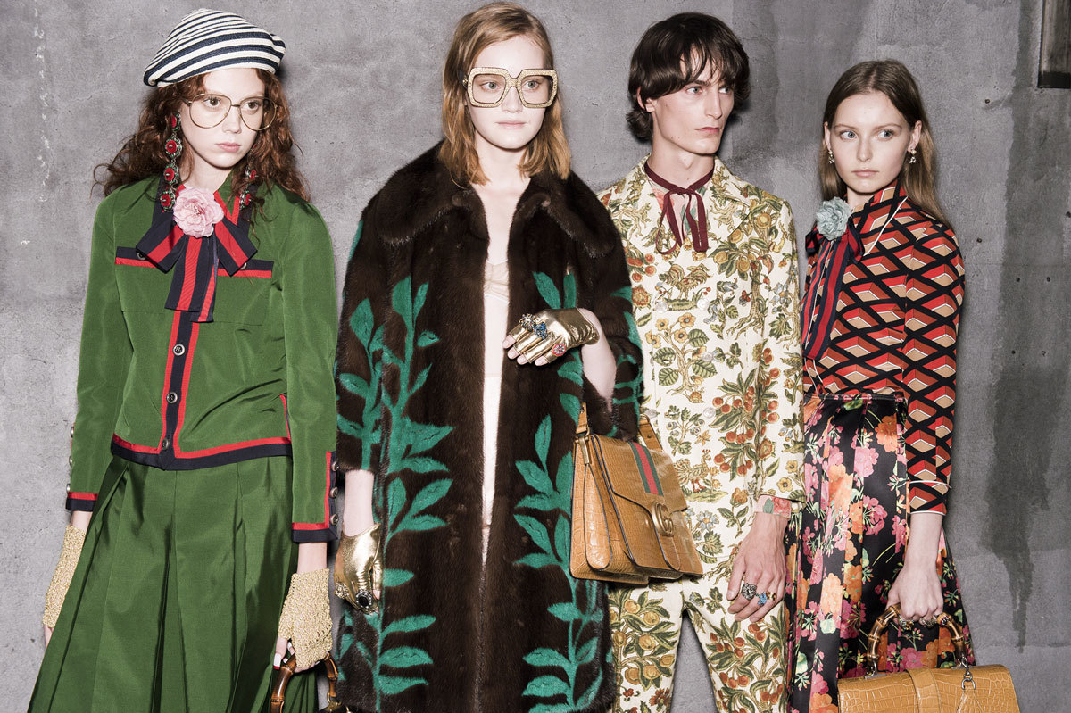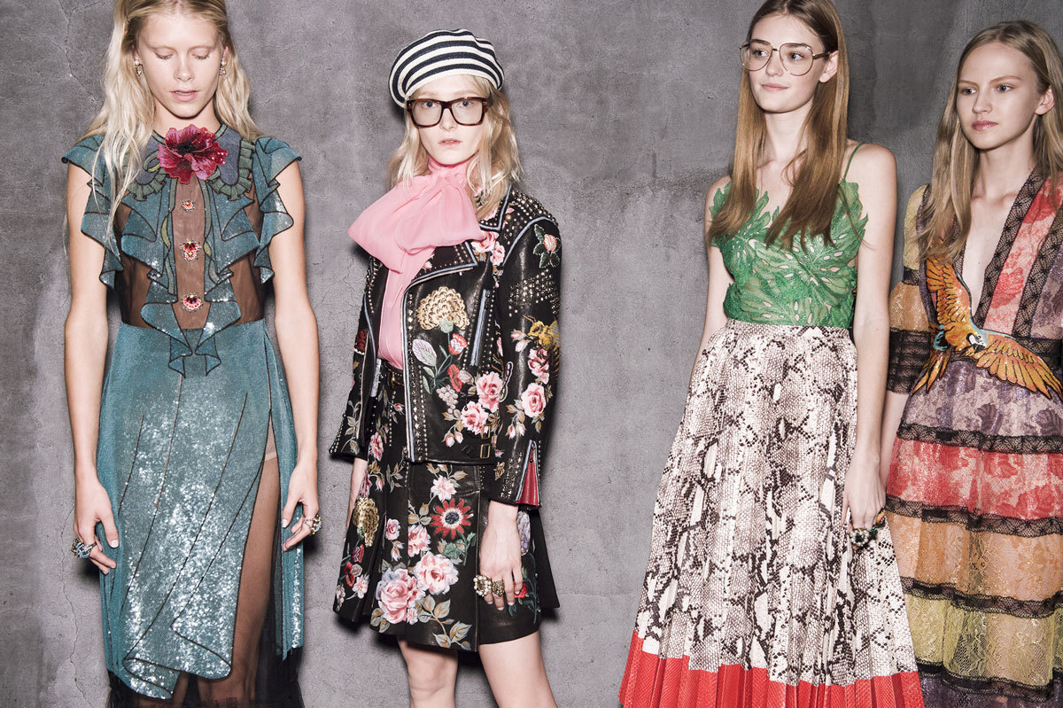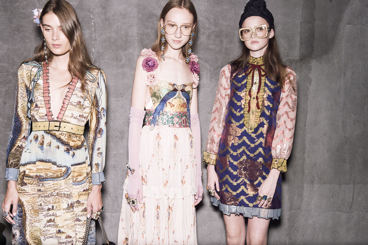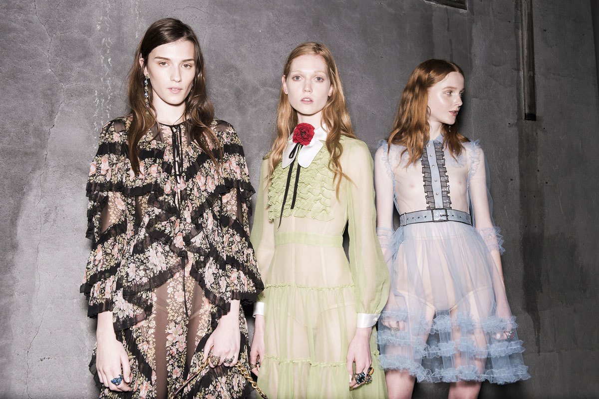 If you want to know what success looks like, compare last season’s backstage situation at Gucci to the one this season. The small group of journalists, who had gone back to speak to Alessandro Michele after his first women’s show in February, suddenly found ourselves outnumbered by the showbiz machine six months on. Dakota Johnson, Alexa Chung, and Kering queen Selma Hayek-Pinault, all getting their fifteen, well, seconds with the new Prince of Milan. In the course of a season, Michele has created a fantasy world so strong at Gucci, you’d think he’d been dreaming about it his whole life—and it isn’t of course unthinkable that during his 15 years at the house, thoughts of conquering the kingdom one day did cross his mind.