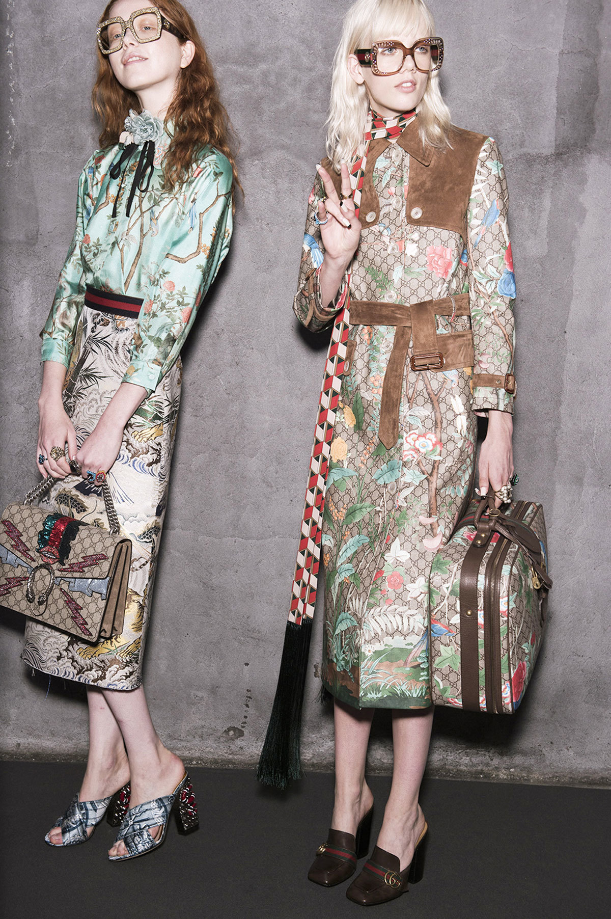 Michele’s Gucci experience is so complete, he instantly achieves what most designers work a lifetime at accomplishing: entirely absorbing his audience into his world before the show has even started. Outside the greenhouse-y new Gucci venue, a biblical flood of Hollywood blockbuster dimensions was pouring down on Milan, turning the show space into a kind of sanctuary — a world within a world. The floor was covered in a botanical carpet with oriental fantasy snakes wriggling their way through the weave, the chairs decked out in regal Gucci upholstery, and dressing screens added to the wealth of prints at the root of the runway. The invitation was embellished with embroidery and gold bees, the show notes printed by typewriter on pink paper.
