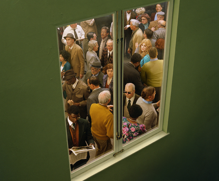 I meticulously stage everything, and I have so much control over every little detail, but it’s always the weird little mistakes that happen on set, or the things I didn’t plan for that happen, that make the photos more exciting for me. For example, there’s this one photo where you’re looking through a green wall with a window at a crowd—you know that photo?