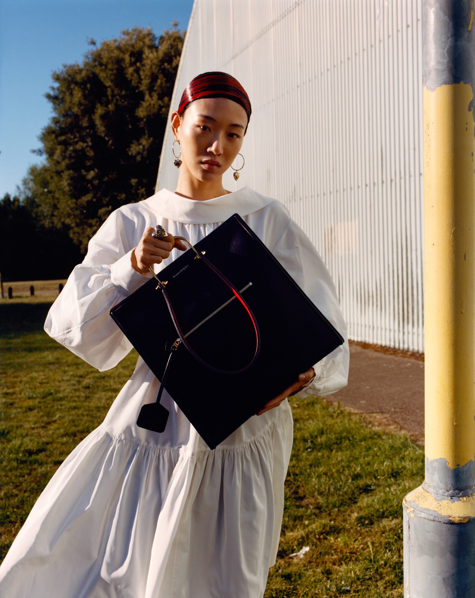 Shot by Jamie Hawkesworth and starring Anok Yai, Sora Choi and Jill Kortleve, the campaign is a celebration of the golden hour you keep seeing plastered all over everyone’s socially distant pub Instagram stories. The pastoral settings are juxtaposed with elements of suburbia — yellow wheat fields are littered in the distance with aerial telephone poles, the hints of warehouses and passing trains, the chipped yellow paint of a lamppost, and punctuated by the collection’s hero bag, the Tall Story. It’s a reminder — and a timely one! — that you can still enjoy the great outdoors without jetting off to sun-soaked foreign shores. Not that it stops us hankering for a holiday anyway.