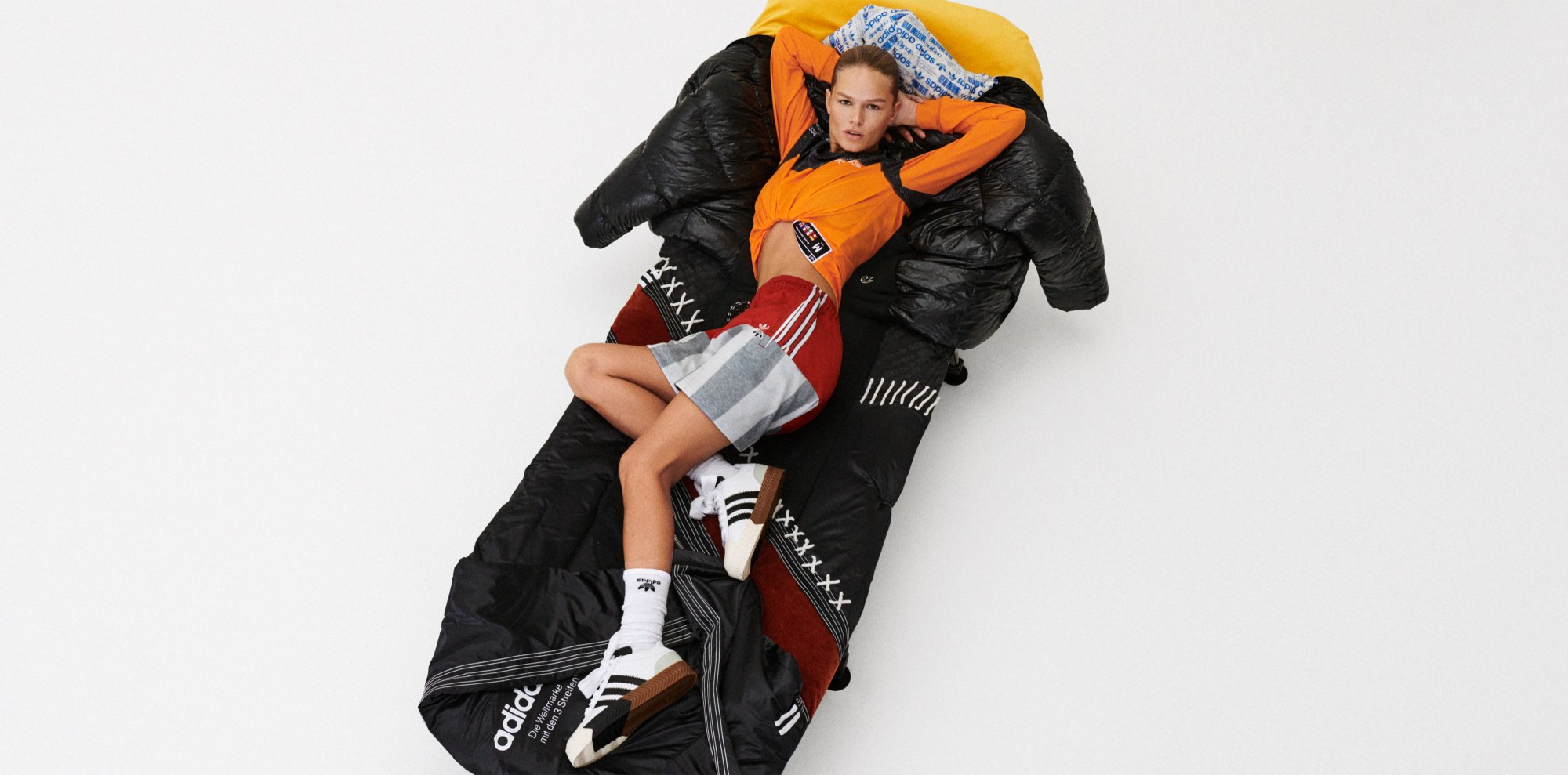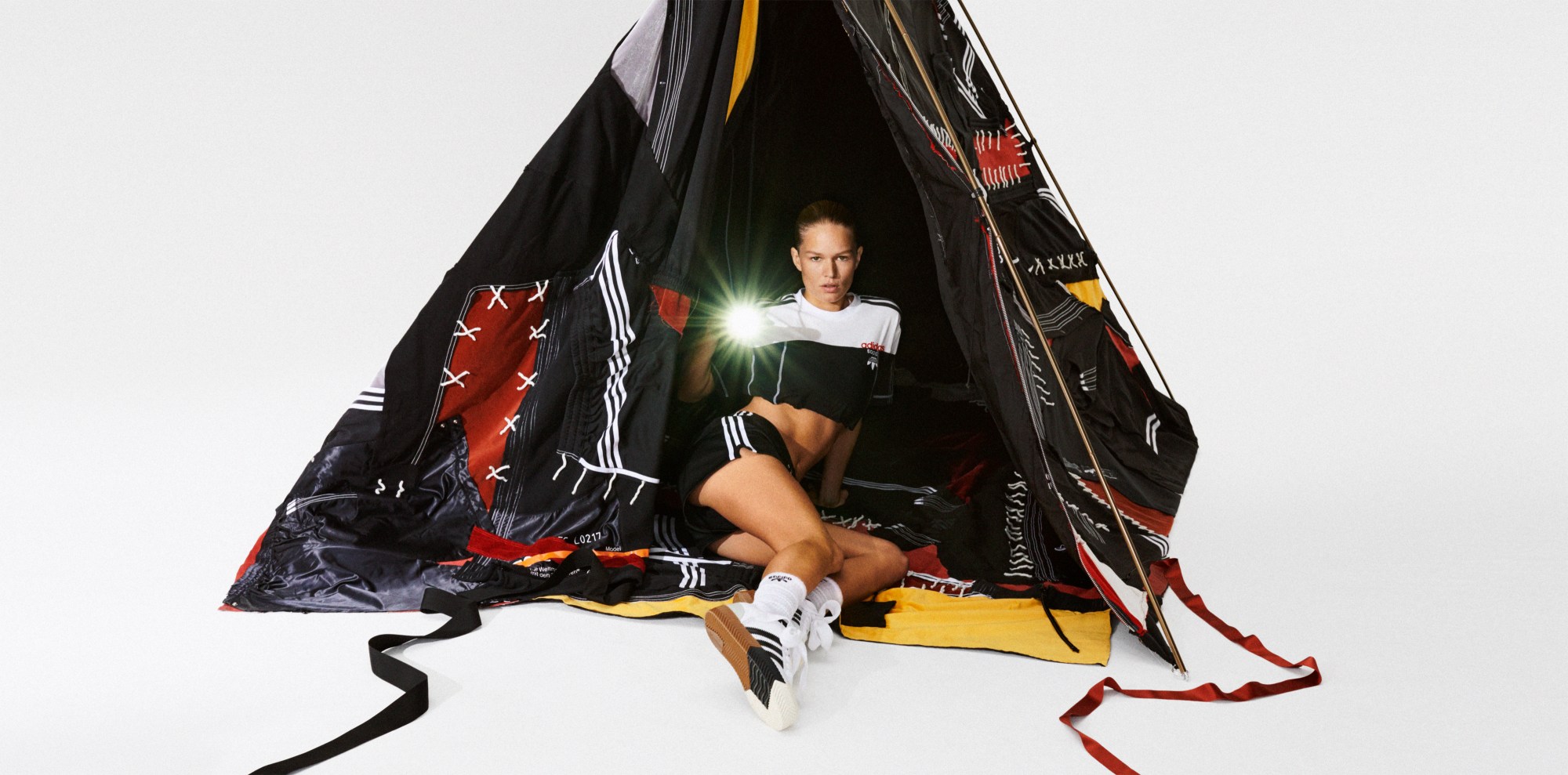 The new lookbook for Alexander Wang’s fourth collaboration is an amazing tribute to the great outdoors. Shot by Brianna Capozzi and Haley Wollens, it features German model Anna Ewers doing her best Girl Guide impression — fishing, camping, chopping wood and giving the Girl Guide salute — all the while dressed in the new collection. Taking on a funny and absurd edge with the fact that the whole thing has all been shot indoors, it sees Anna roasting a trainer over a pile of logs, as well as raising a pair of shorts as an impromptu Wang flag over her studio campsite.