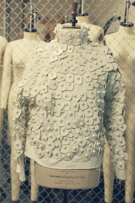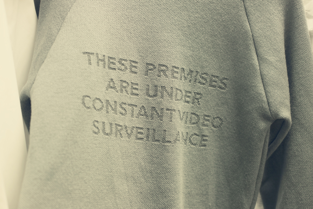 I’m looking at signage, and the subversion of the sportswear genre into crime. I’ve got lots of slogans you see in stores, am looking at the way stores prevent shoplifting, and creating garments that sort of evoke this. Taking something that’s not usually considered “fashion”, something not usually considered in the process, and making it a focus. So using security tags, usually it’s just one on a garment, it’s hidden, it’s to prevent you from just walking out the store. But then taking that, bringing it out and covering the garment in it. I quite like mass and excess, over the top.