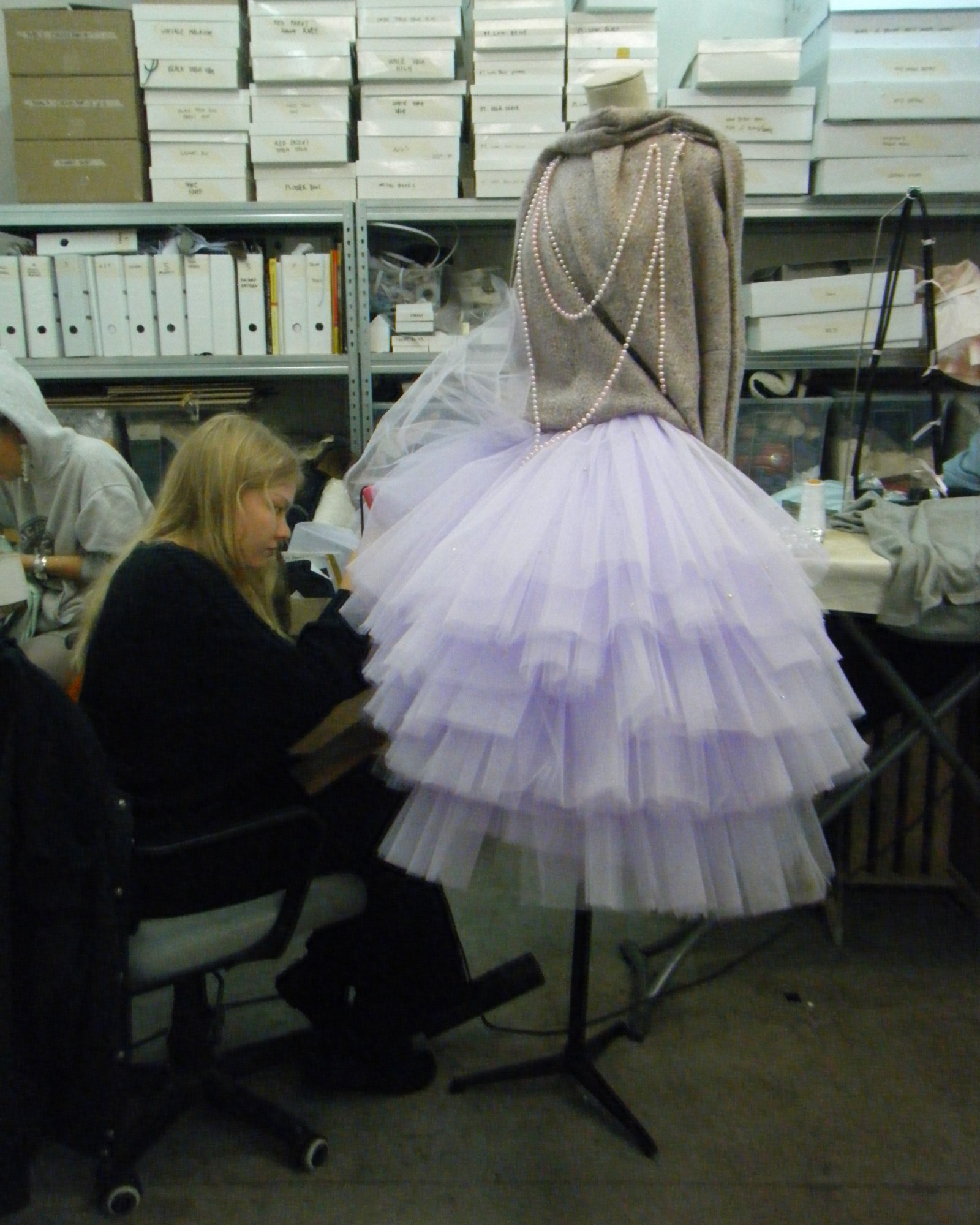 SS25’s ingénue follows in the footsteps of beauty pageant queens, debutantes and last season’s imaginary pop star, Allina. “The collection is called ‘Uptown Girl’ and it started from watching Working Girl (1988) again,” Barron says. “But we also got inspired by many different types of characters along the way. Mostly New York characters like Carrie Bradshaw and Desperately Seeking Susan (1985).” With her “head for business and bod for sin,” the spirit of Working Girls’ Tess underwent an All-In makeover: think while sheer skirts embedded with strings of oversized pearls, tufts of polka dot tulle over sequin booty shorts, and recycled denim jackets courtesy of Guess USA repurposed into skirts. This time around, the signature Level Boots were relaxed and slouchy, while satin ballet pumps fused with strappy heels and misshapen Frankenpurses to combine three styles in one.