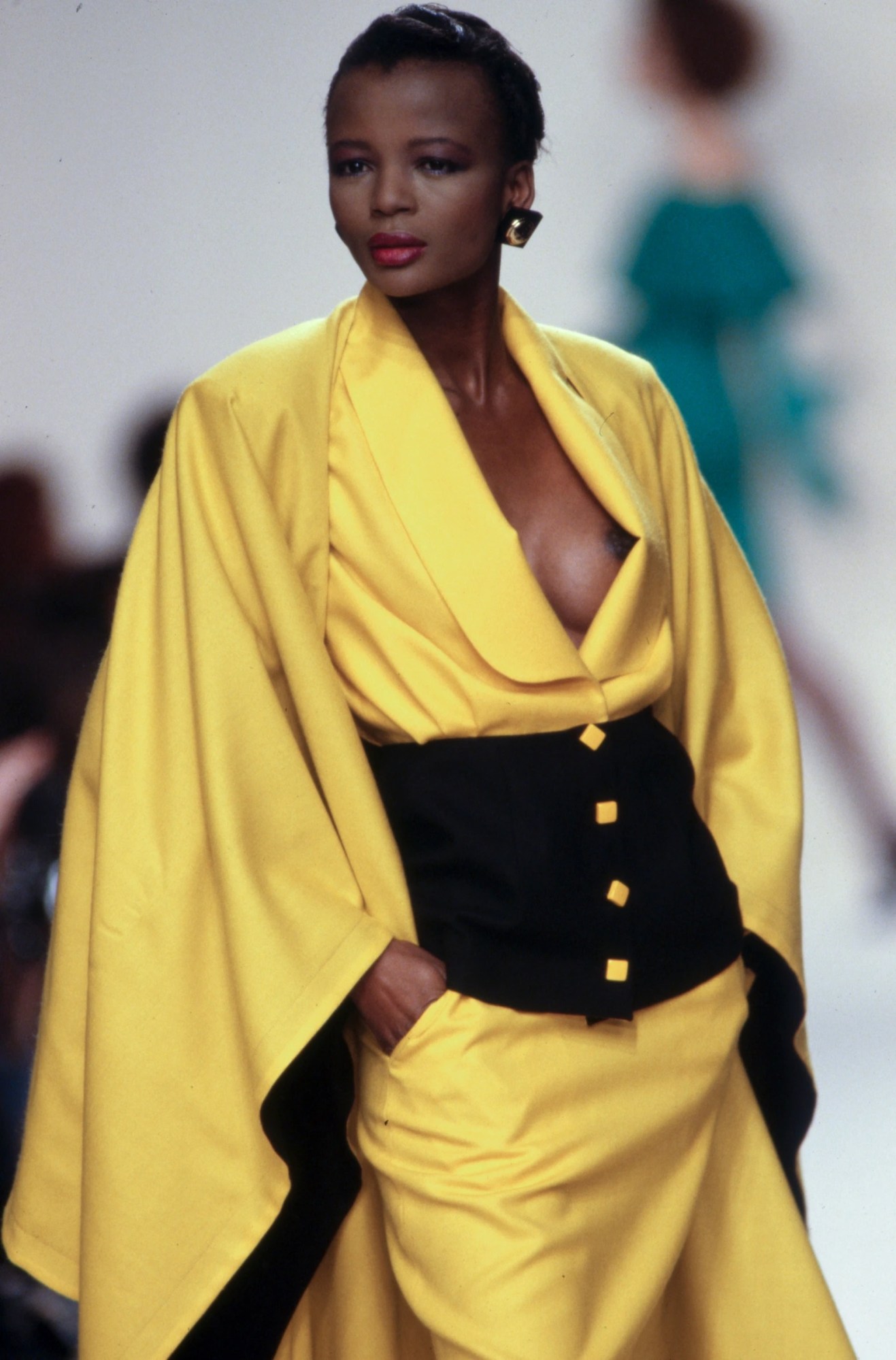 A model walking the runway at in flowing yellow gown at Patrick Kelly's AW89 show