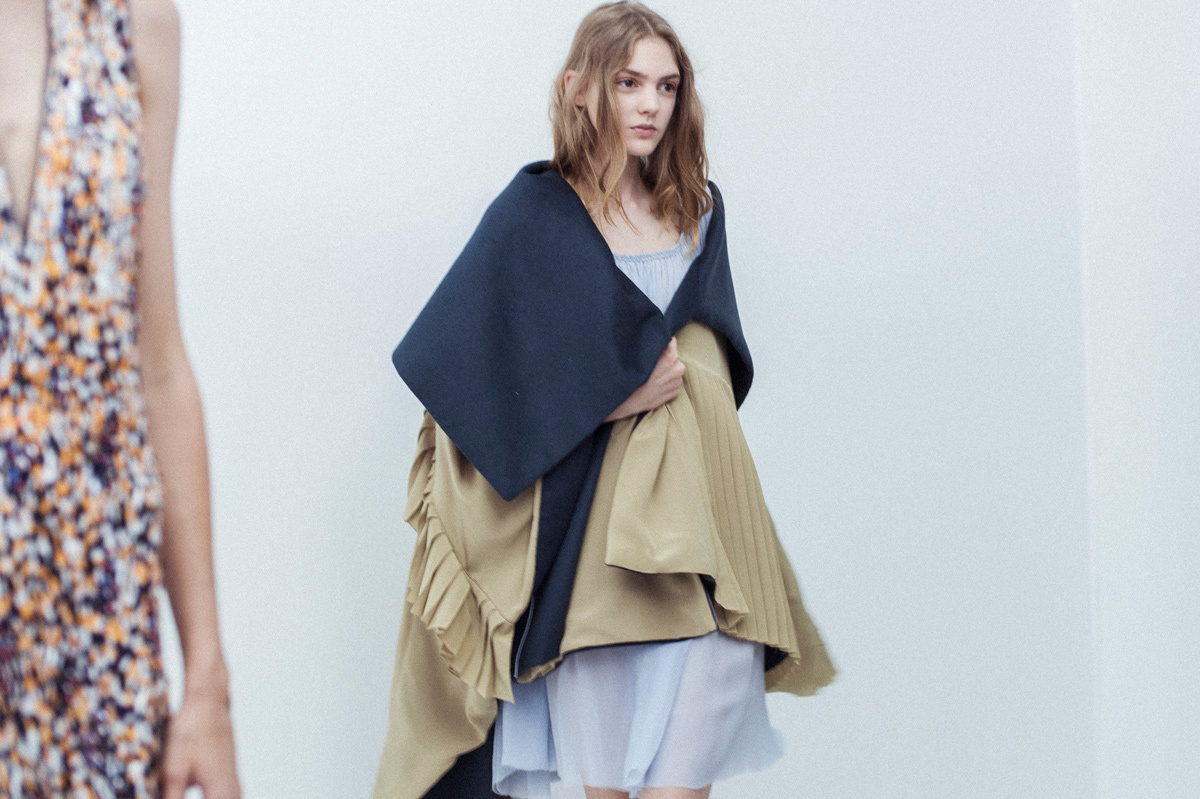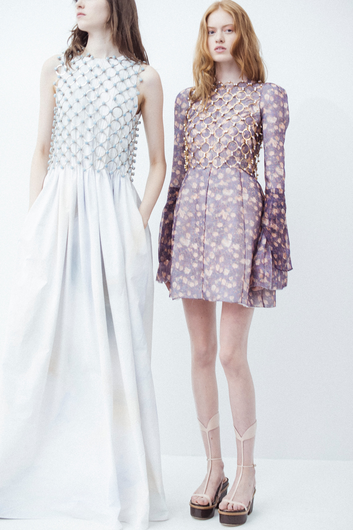 Stepping straight out of Raf’s Garden of Earthly Delights — a medieval folk tale seen through a trippy 70s lens — models including Lineisy Montero, Julia Nobis, Lexi Boling and Mica Arganaraz hang out backstage in soft natural light, which catches on the jeweled chainmail vests that overlay floaty Maid Marian gowns and mini dresses with flared sleeves. The ethereal gowns are counterbalanced by heavy wool capes with colorful, stitched silk linings, and velvet bell bottom trousers over chunky glitter platform sandals.