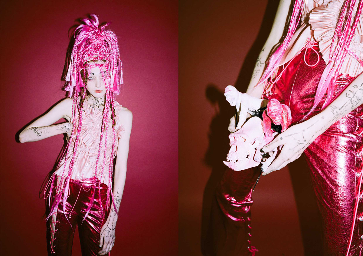 Angel’s collections are bold: the color palettes and attitude are a pastiche of romantic BDSM, cult 90s Japanese magazine Fruits and John Galliano circa 00s Dior, which is no coincidence as Galliano also happens to be her design hero.