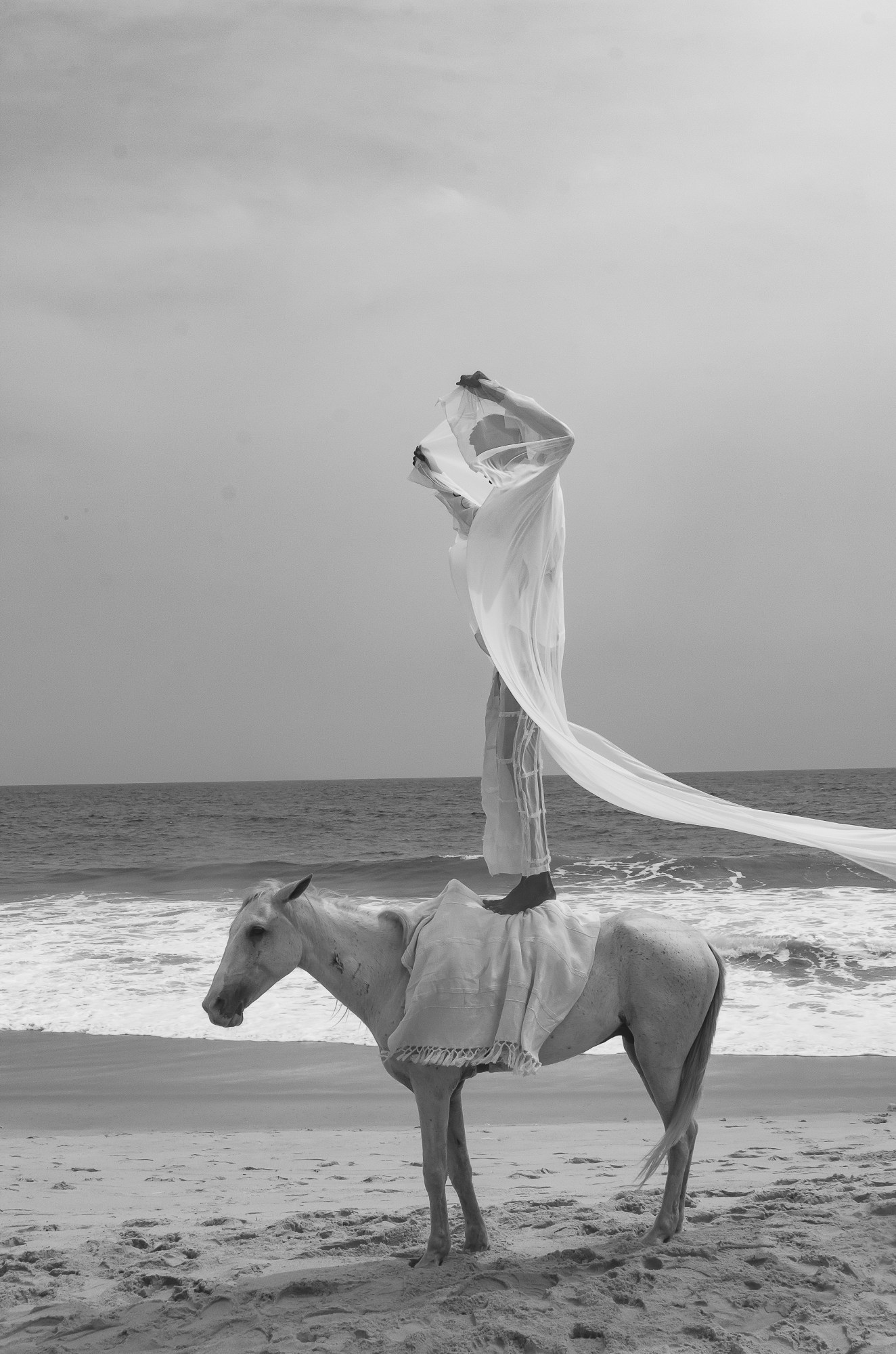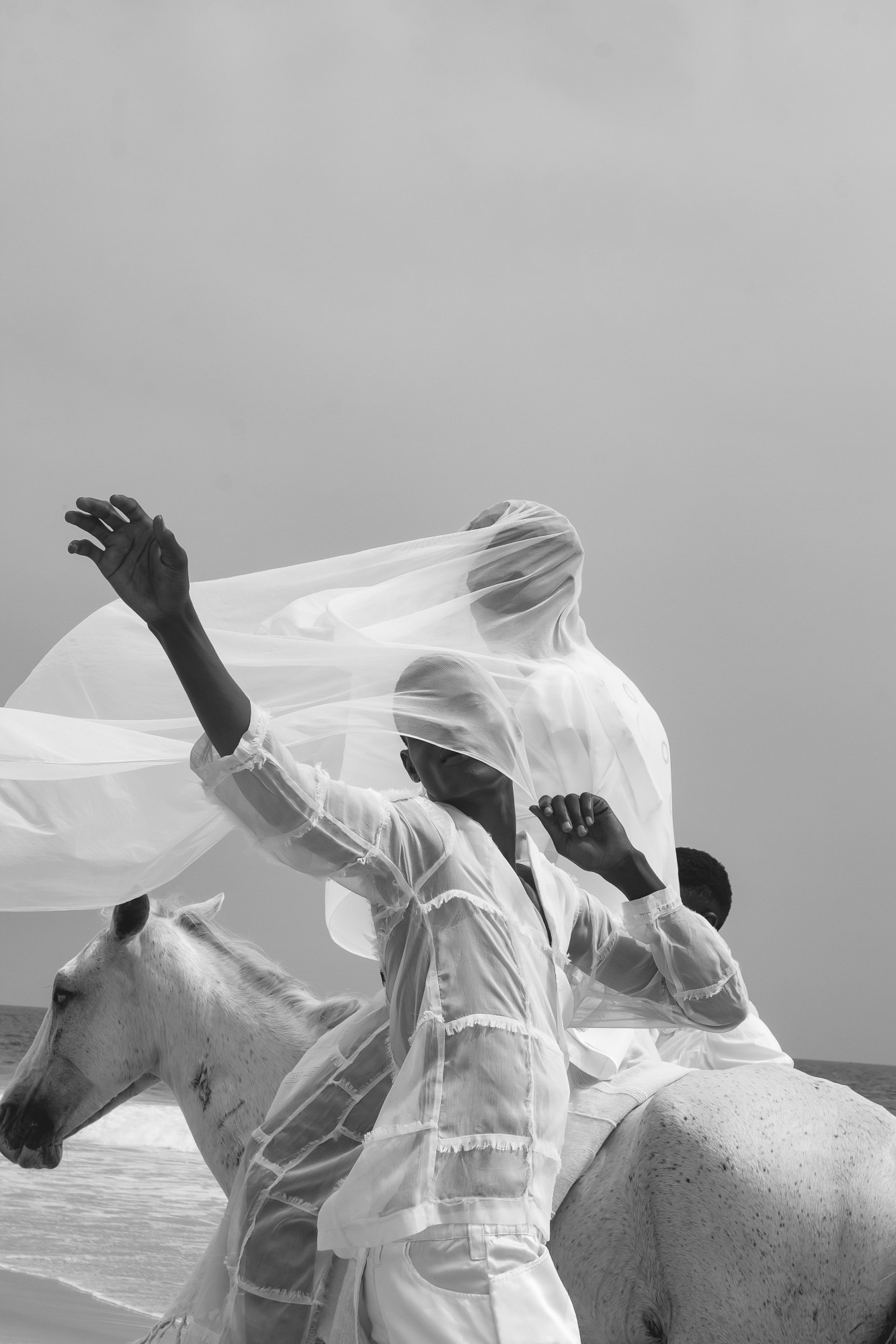 Collectively, these artists explore the idea that cowboy communities are not corralled to North America’s rural West, but exist in urban environments globally as well. Devin B. Johnson’s abstract compositions City Slicker 1 and 2 allude to the cowboy’s presence within the heart of densely populated locales. Likewise, Daniel Obasi’s triptych cinematic photographs, “Moments of Youth”, taken in Lagos, Nigeria, depict a regal white horse with three subjects adorned in swaths of diaphanous fabric. For Daniel, the images represent “nostalgia, escapism, the joy in communal fellowship with like-minded people, vulnerability, and the strength in holding space for one another.”