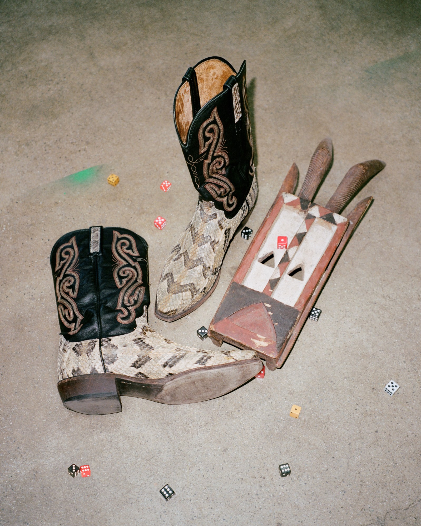 Aligned with one of Helmut Lang’s central brand pillars — a celebration of transgression — the inversion of the word “ART” speaks to the increasingly exclusionary modus operandi that is rapidly shifting in the art world, as it adopts a more open perspective instead. The intention behind Antwaun’s design unspools directly into the coalescing thread of the exhibition itself, making a claim about not only who gets to be understood as a cowboy, but also who gets to question and explore the parameters of this distinctly American iconography.