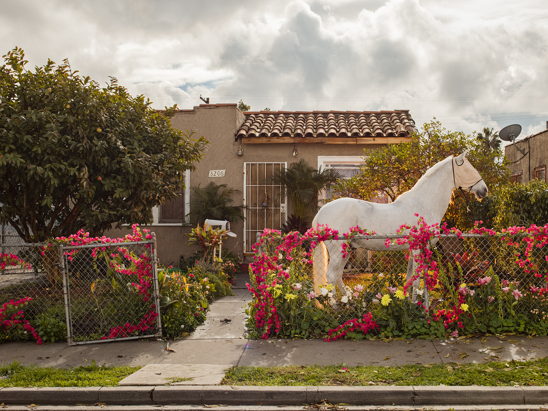 Collectively, these artists explore the idea that cowboy communities are not corralled to North America’s rural West, but exist in urban environments globally as well. Devin B. Johnson’s abstract compositions City Slicker 1 and 2 allude to the cowboy’s presence within the heart of densely populated locales. Likewise, Daniel Obasi’s triptych cinematic photographs, “Moments of Youth”, taken in Lagos, Nigeria, depict a regal white horse with three subjects adorned in swaths of diaphanous fabric. For Daniel, the images represent “nostalgia, escapism, the joy in communal fellowship with like-minded people, vulnerability, and the strength in holding space for one another.”