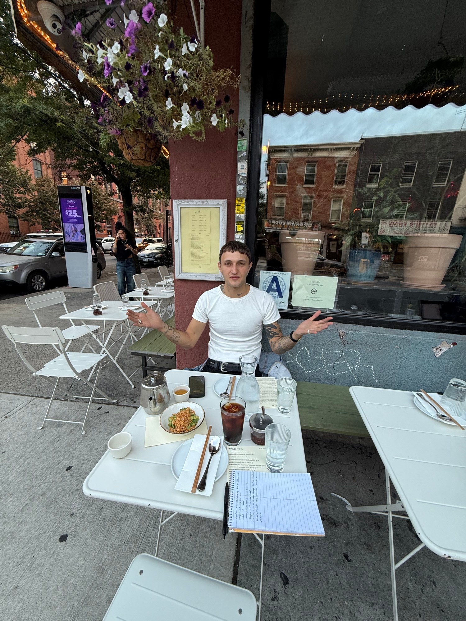 It’s a warm September evening in Bushwick and I am two minutes late because I got the location wrong (my fault entirely) and took us to Win Son Restaurant (sit-down, self-serious but delicious) not Win Son Bakery (infinitely cheaper, down-to-earth, inspired date spot). Anwar is already sitting at a table outside, watching people pass.