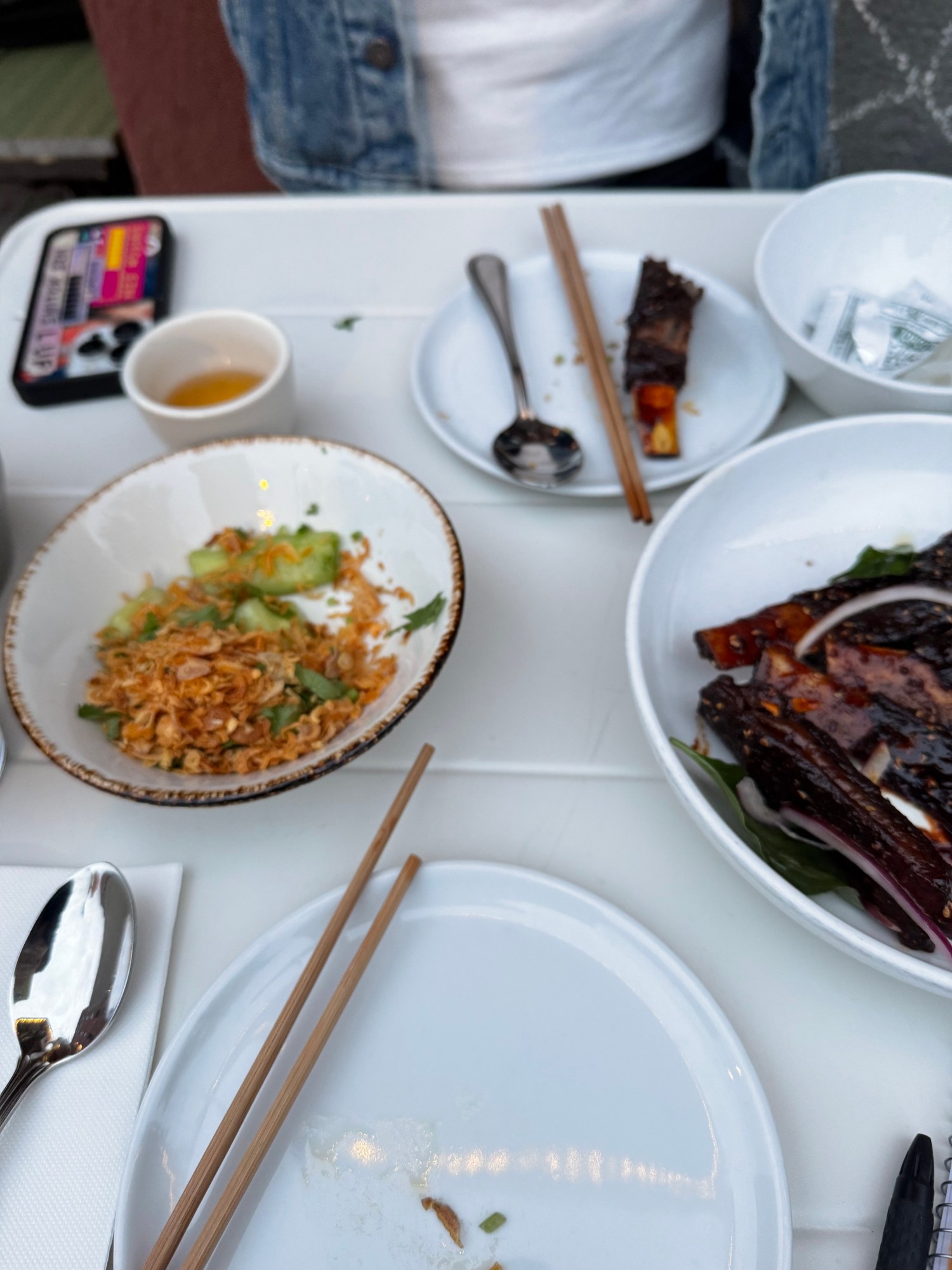 Back to the menu: Hadid scans the offerings, asks about my dietary preferences, dislikes and otherwise. He’s adamant about ordering something we can share. “I want to make sure we get something you can eat,” he insists. We end up with spicy cucumbers and ribs. The cost of this cheap date remains undisclosed because I got the place wrong. Fine, it was like 50 bucks. He tries valiantly to pay for the check. I swat him off. He pours us both tea.