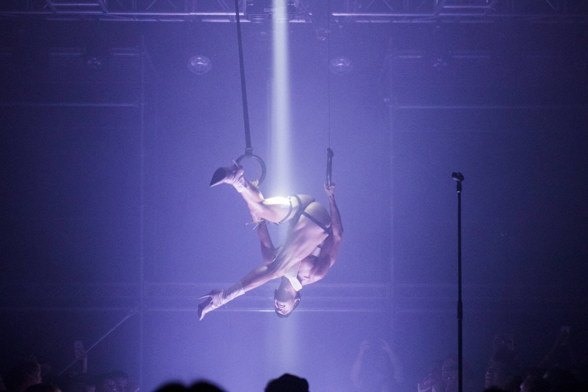 Let’s start at the beginning. Attendees entered the show (staged inside a cavernous East L.A. warehouse) by passing through a decontamination chamber-esque installation. Flashing strobes and smoke filled the chamber as officers in full SWAT gear “scanned” each group, like a scene out of Alien. At the back of the space, a sprawling stage was erected in multiple tiers, as if it were scaffolding snaking through city blocks, or a giant jungle gym. Billowing swaths of translucent fabric, illuminated by soupy ambient light, softened the industrial edge. A platform of stairs led up to the center of the stage, where two gymnastic rings swayed gently. The entire space was strewn with fake white rose petals.