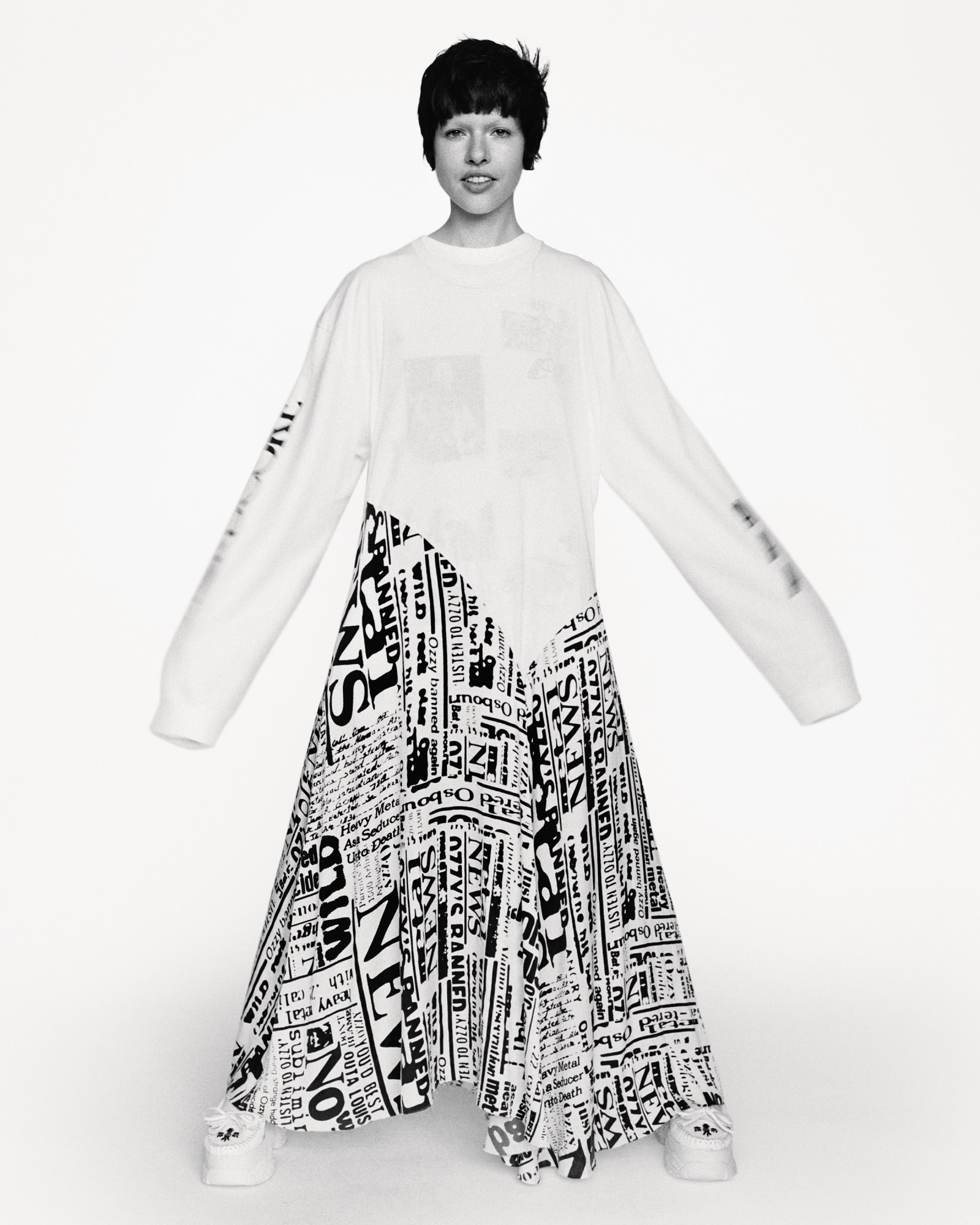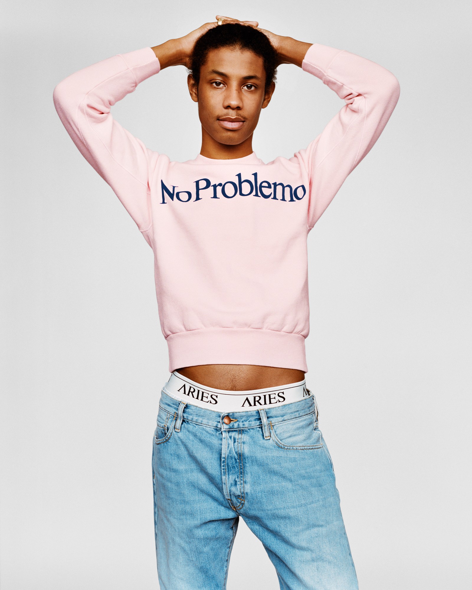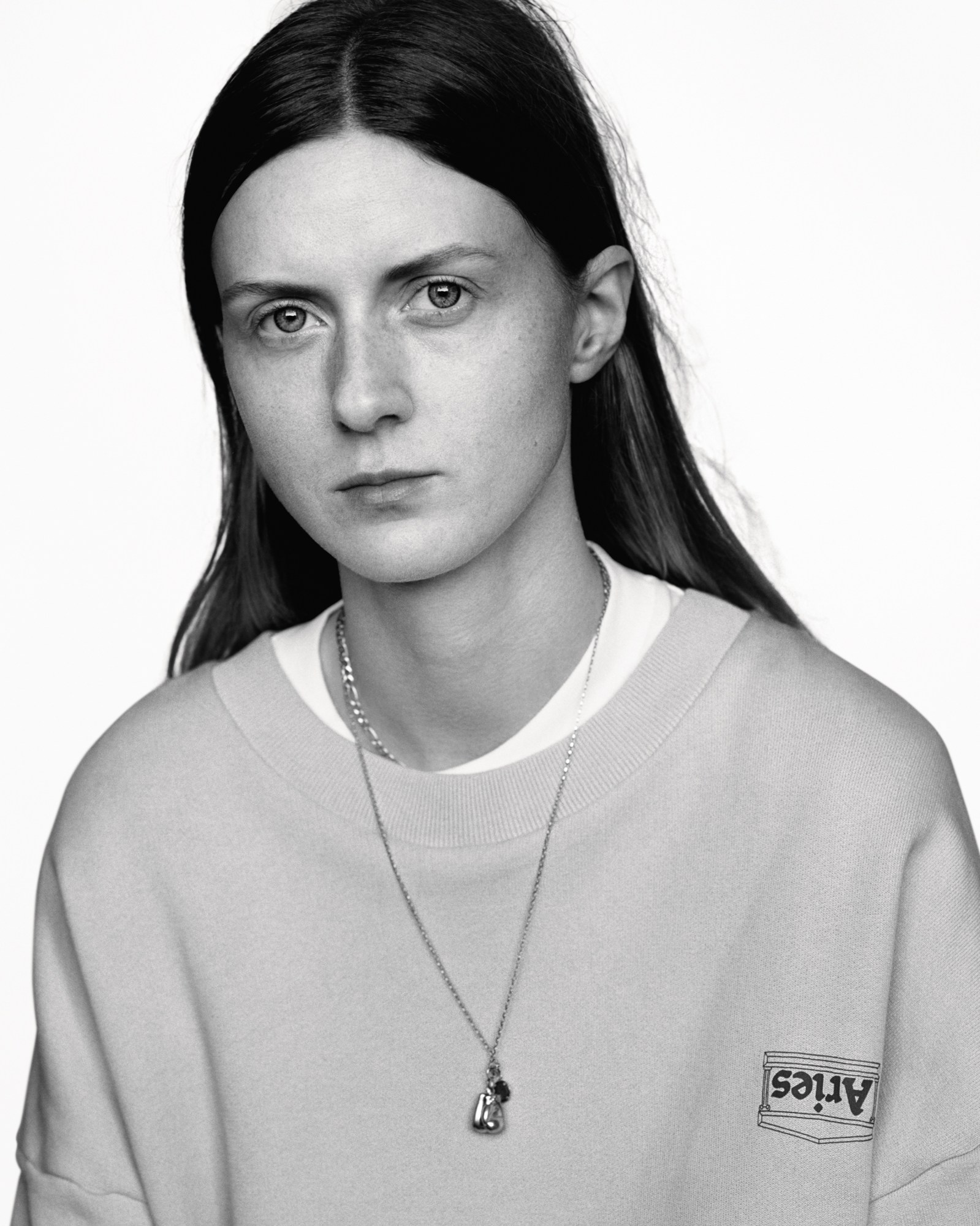 “If what we did then wasn’t as clear, I think it was because I didn’t have the mental strength, the arrogance, really, to define it aggressively. I’d spent the last seven years looking after my children, not putting myself out there. You come back, you’re older, more fucked up, more tired, you have more responsibilities. No one talks about it, but it’s true. It’s terrifying. You have to have courage.” But Aries has become the most covetable, most wearable, most enjoyable of brands, precisely for all that which has gone on. It feels human and friendly and approachable as well as being interesting, cool and sexy. It helps too that the current generation don’t really give as much of a shit as the one before about gendered dressing. What made it difficult to sell at first has become its strength, which is its flexibility. These things usually always work the other way round. Streetwear is designed for men, and girls wear it. With Aries it was refreshing to see men being forced to make that similar effort to cross the gender binary. It was the girlfriend jean instead of the boyfriend jean. It had a feminine edge that made it stand out. It was that that saw it adopted into fashion and wider culture, that now means Aries can collaborate with the likes of David Sims, Jane How and Jeremy Deller.