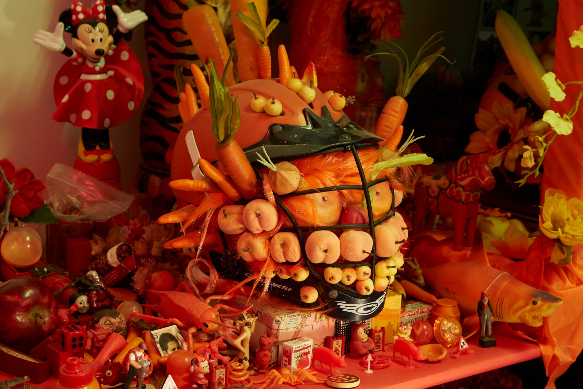New York-based artist Nick Atkins’ latest exhibition Nocturne is comprised of new paintings, sculptures and a giant, bizarre, color-coordinated shrine. The show, which is on display at Entrance in New York, centers around an ongoing sci-fi fantasy narrative called “Hanji Party.” It follows the adventures of its main character, Harp, and his alter-ego/imaginary friend, Party Fanatic, both which serve as a kind of coping mechanism for Atkins’ feelings of hopelessness concerning society’s environmental misdeeds.