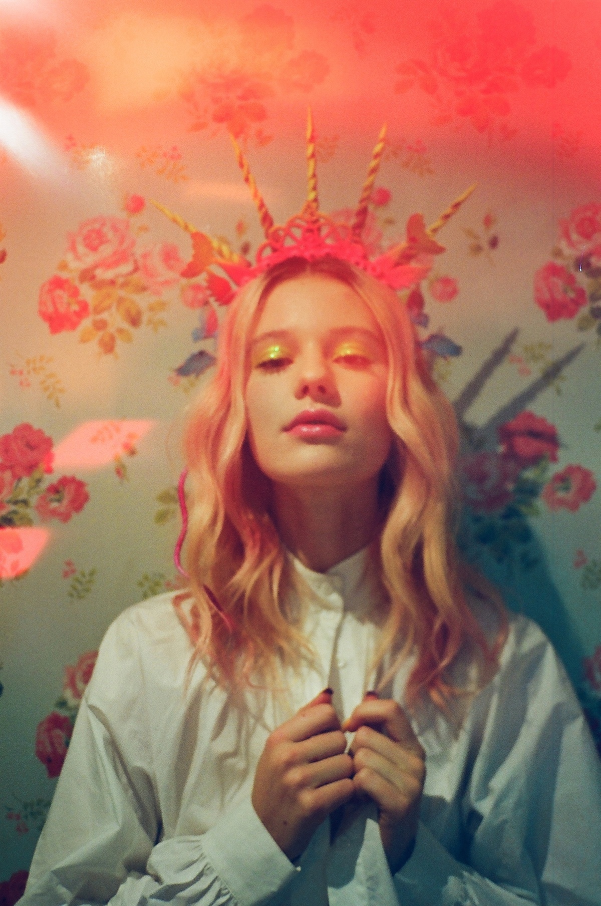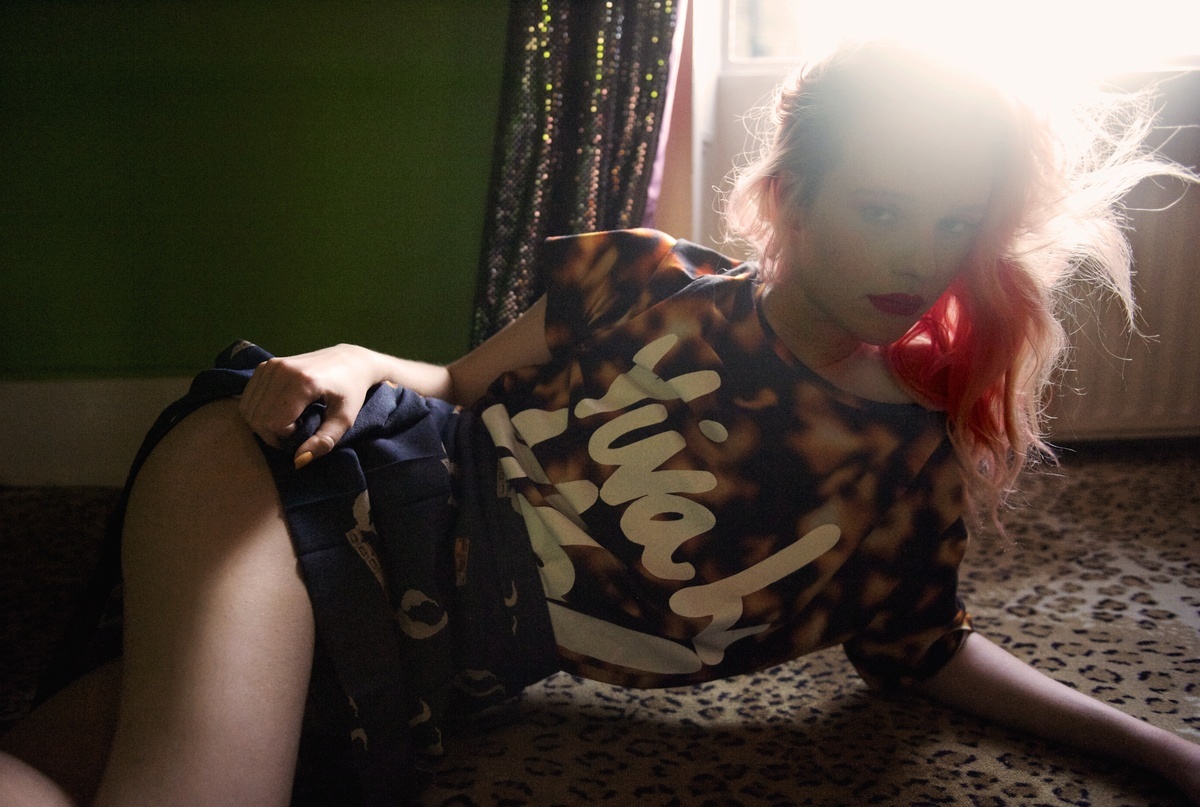 Arvida Byström, de Estocolmo, tiene 22 años y cuando era niña soñaba con ser una princesa, creció con internet y ahora es una feminista de tercera ola (¿o quizá hasta cuarta?) con una actitud “cabello rosado, ¿y qué?”, una galería en el East London con suelo rosa y un vestido bautizado con su nombre a cargo de Meadham Kirchhoff. Entre sus anteriores trabajos artísticos se incluye Girl Gaze, una revistilla para que las chicas sexualicen a los chicos; trasladarse a la Wayward Gallery durante una semana con el artista Tim Kelly para retransmitir el desarrollo de su relación incluyendo el sexo (bajo las sábanas) y depilarse para perder su ‘hollywoodiense’ virginidad con la cera, con el objetivo de mostrar sus escépticos puntos de vista sobre la monogamia, y una tonelada de selfies publicados en su Tumblr que se han diseminado por todo internet mediante “shares” y ♥’s. Poniendo en tela de juicio los estereotipos de género a través de asuntos estigmatizados como el período y el vello corporal, te guste o no, ya sea enmascarándolos en bonitos colores pastel o de forma “agresivamente de chica” (como una de sus amigas describió en una ocasión su Tumblr), Arvida tiene algo que demostrar y dispone de toda una red mundial de chicas que opinan de forma similar, entre ellas Tavi Gevinson, Petra Collins y el resto de sus colegas del colectivo femenino de fotografía The Arduous, para respaldarla.