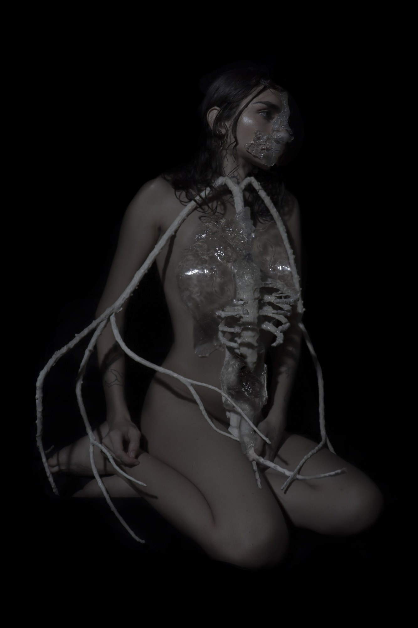 Materials that are near-obscene to the public eye, such as distressed prosthetics, fossilized glass and distorted organic tissue, strengthen Aun’s narrative. She goes on to recall her introduction to prosthetics as an 18-year-old, a paradox of feeling a very familiar sensation of strangeness although she’d never seen the material before. They remain key to her practice, as they help to narrate her own process of deconstruction and reconstruction. “I’ve always felt trapped in my own body. I’ve experienced many strange frequencies, and prosthetics sparked the same sensation of strangeness,” she explains. “It’s like fantasy flesh. Nothing is definite, you can change everything. It made me realize that I can change my body too.”