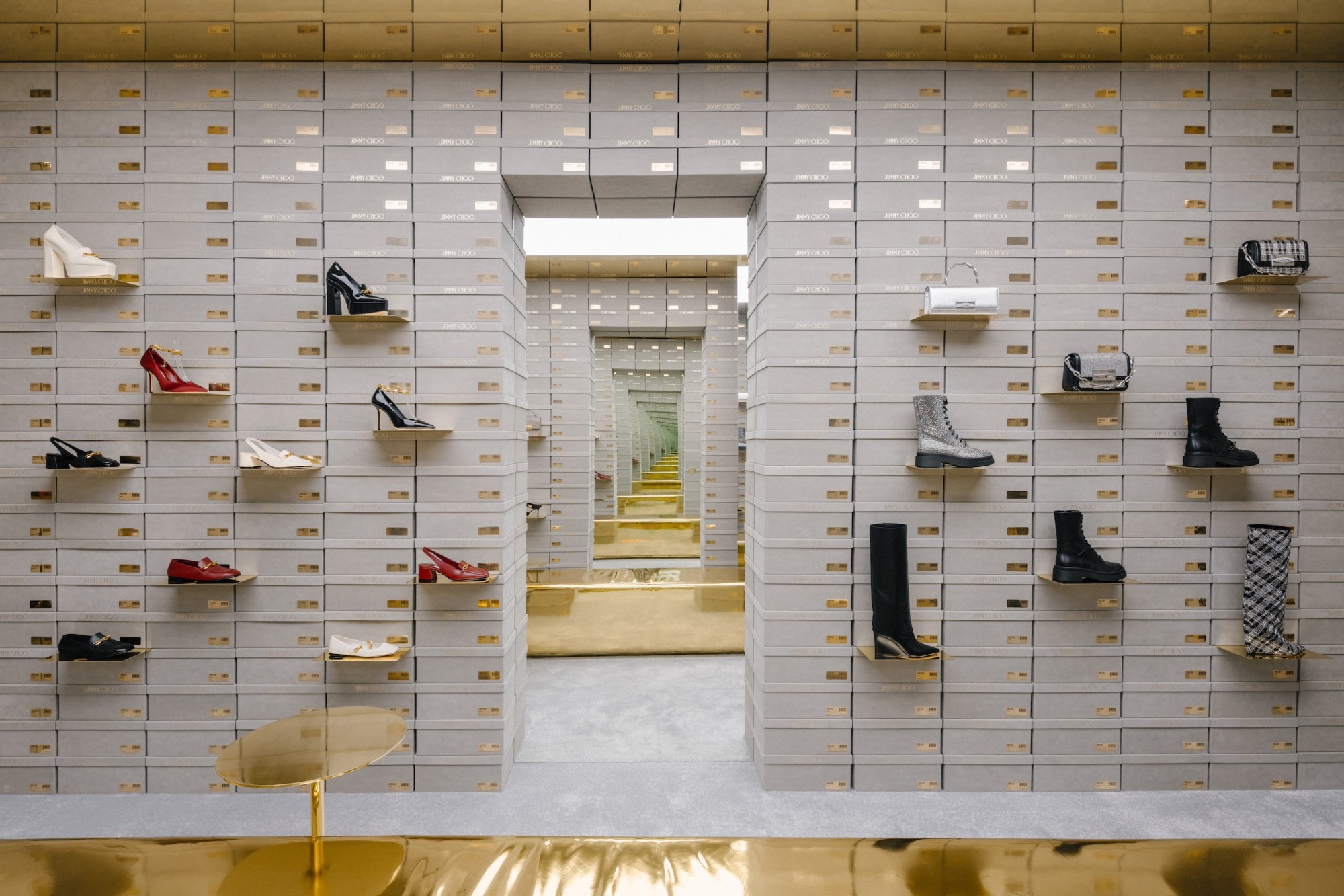 Anyone who has worked in fashion retail will know that the safe space of any store is the stock room: the place to escape the chaos of the shop floor and pretend you’re searching for the jacket that aggy customer was asking for when actually you’re sitting between rails and scrolling TikTok. Well, at a pop up Jimmy Choo boutique on 34 Avenue Montaigne in Paris, the shop has been flipped on its head as the stock room becomes front of house in a new concept by interior design and architecture extraordinaires Crosby Studios. Shoe boxes line the walls, alongside gold ‘bullion’ seating areas and infinity mirrors, in an oyster-hued space that carries limited edition must-haves and collector’s pieces from the house. Having opened during Paris Fashion Week and remaining there until December, this space is just a taster of what’s to come, as Crosby Studios are currently working on the design of a Jimmy Choo store in Japan set to open at the end of this year! TG