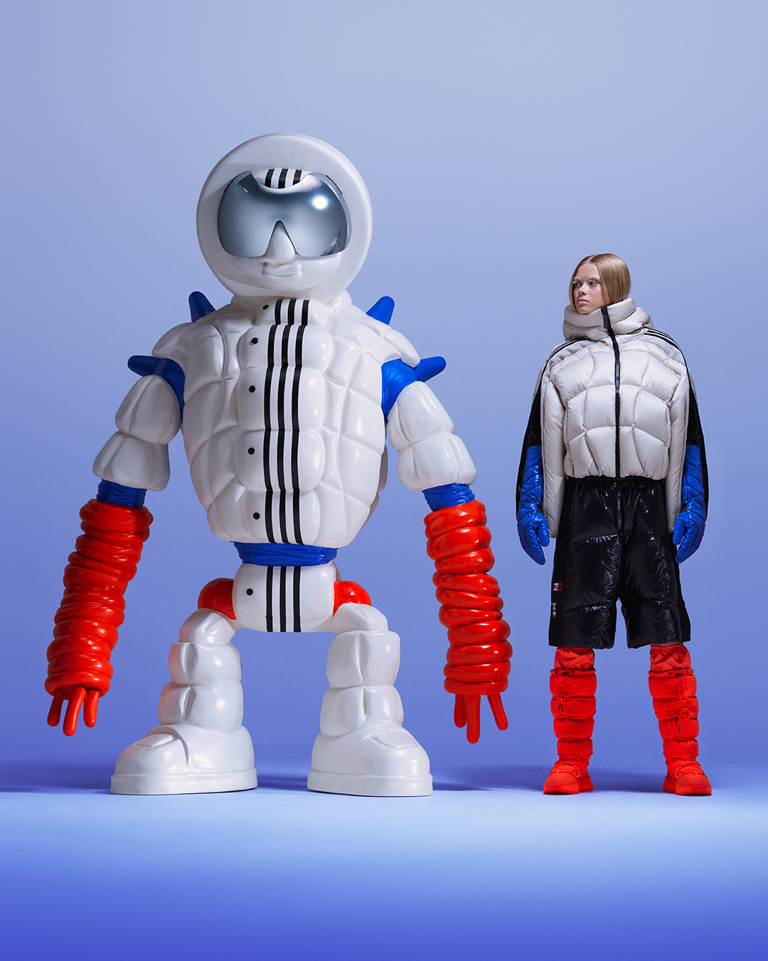 It feels like only yesterday Moncler took over fashion week with that not-so subtle activation, known formally as ‘The Art of Genius’. For anyone that’s forgotten, we’re referring to early 2023’s de facto Collab Con, when every brand worth its salt got the Monclerian makeover. Adidas, Mercedes-Benz, Fragment and even musicians – not that there’s a difference, today – including Pharrell Williams, Jay-Z and Alicia Keys were just some of the fashion and fashion-adjacent names listed. Now, months on from its first tease, Adidas’ capsule hits the digital billboards in what can only be described as a post-human fashion campaign cum fever dream. Enlisting all the best in the game, from spooky set designer Gary Card to makeup monarch Isamaya Ffrench, Adidas and Moncler share their wares alongside bizarro snow yetties and three-striped puffer-coated aliens (Gary’s doing). Dripped out in down-duveted outers, cinched track tops and Trefoil-embossed double-zip pullovers, the monsters (and models) flex everything the modern-day mountaineer needs. Whether you’re popping out for milk or climbing Everest, this is the wardrobe. And yes, even the hypebeast’s fav Adidas trainer, the NMD, gets a pullied and padded treatment care of Moncler. If you’re strictly a Campus sneaker girlie, there’s a hot-cerise platformed treatment in there, guaranteed to get ‘miring stares from your chalet crush. See you chez après-ski. JB