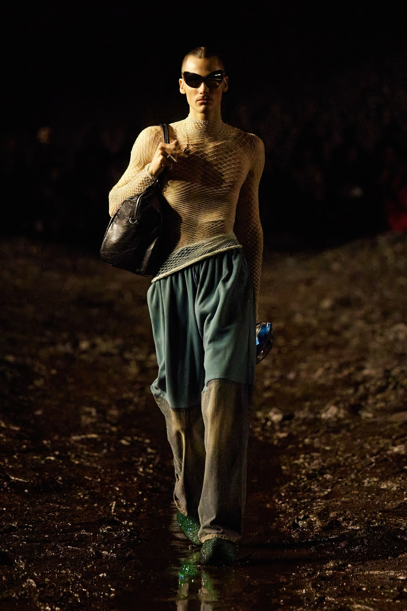 Welcome back to the world of Balenciaga. This time, we’re immersed in a giant mud bath, almost like a damp construction site or a music festival, the mineral-rich scent of which fills the air (turns out the set was the work of Spanish artist Santiago Sierra, with a scent of petrichor molecule designed by Sissel Toolas to evoke the smell of wet earth after rain). Mountains of wet mud line the walls, and I observe editors trying to avoid dirtying their leather boots as they make their way to the corporate office chairs that comprise our seating. The message this time? Being down to earth, literally. Ye opened the SS23 show in a hulkingly large cargo jacket with the word ‘SECURITY’ emblazoned across the chest, worn with leather biker pants and a Balenciaga-branded mouthguard wedged between his teeth. He looked like he might be clearing the way for people to follow.