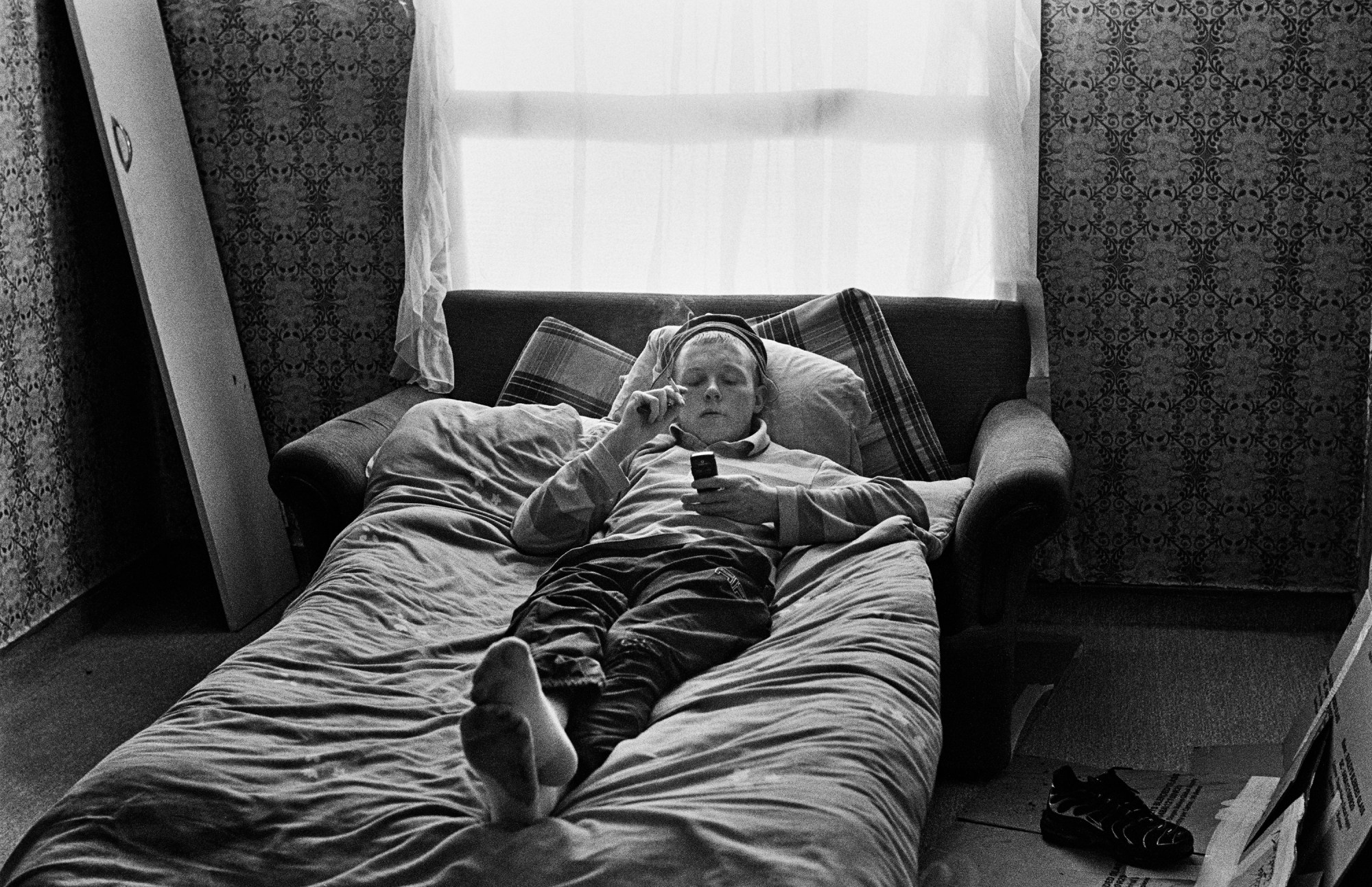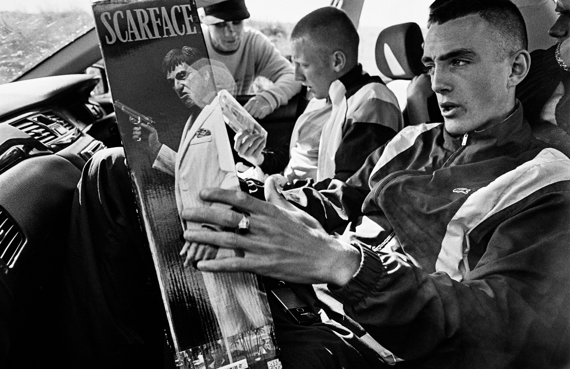 Ross took photographs in Ballymun for the next six years, remaining in and around the community until 2013. His project, entitled Joyrider, presented life on the estates (known colloquially as ‘The Block’) through the eyes of its mostly male youths, their lives a mixture of hardship and hedonism. Drug dealing, joyriding, and vandalism are captured with a poignant touch; in one image, a man cradles a double-barrelled shotgun as light falls gently on a sofa behind him. But Joyrider is also marked by community spirit, stoicism and humour Ross first identified on that Halloween evening. A man sits in a car holding a Tony Montana Scarface doll, his expression wry and knowing; another cushions a toddler in an armchair while relaxing with friends, a simple act of care in a graffiti-ridden flat.
