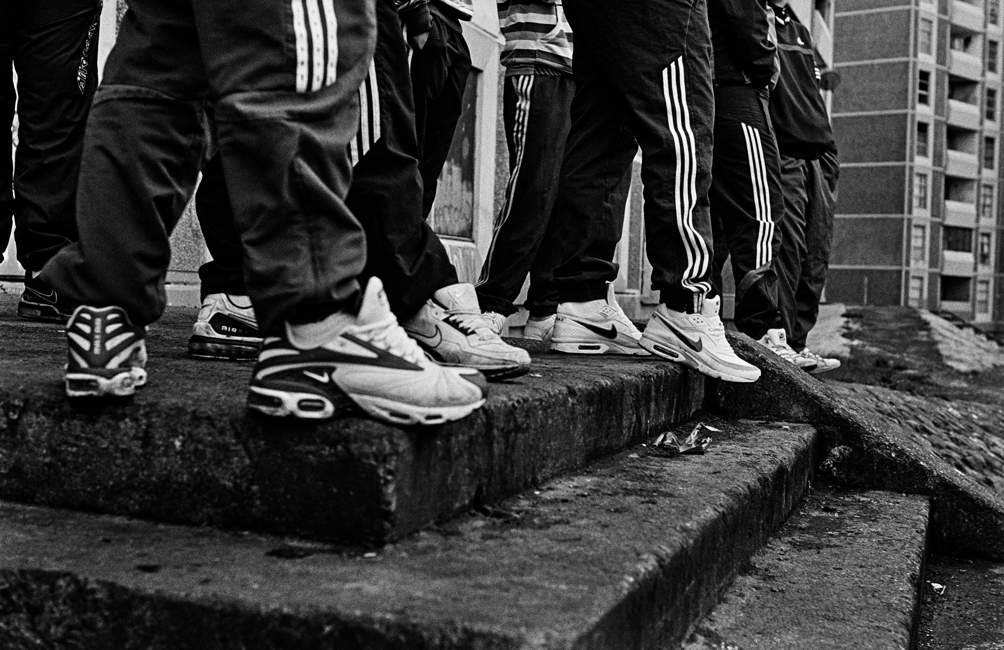 Feeling rejected by the government and Irish society fostered a sense of pride and defiance. Tight-knit families would stop the police from being overly aggressive with their sons, and would create their own community programmes where the council had failed. Closeness and trust are conveyed through tactility in the book: boys pile into cars, hold each other tightly on motorbikes, and huddle while smoking in dark doorways. In one image, 13 boys line a balcony while two firemen extinguish a burning motorbike below. “Fuck the Garda” graffiti is visible in the background. Strength is drawn from shared values, but also the comfort of outward sameness. One of Joyrider’s most arresting images shows six boys wearing Adidas tracksuit bottoms and Nike Air Max trainers. Streetwear as uniform; one identity shared among many. Joyrider, singular.