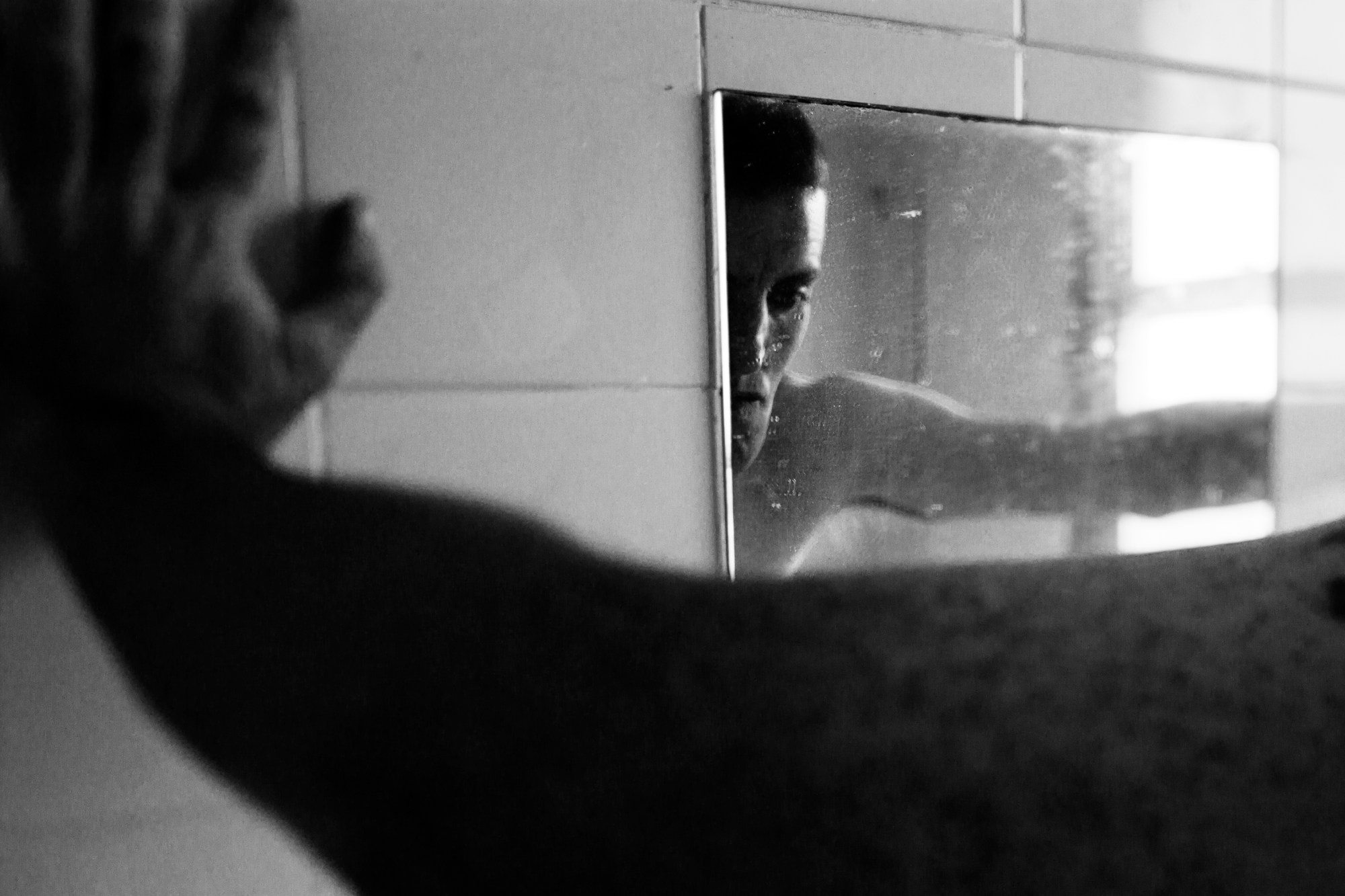 The photographs of lone subjects are more introspective, referencing the private struggles and survival tactics of life on The Block. Joyrider’s penultimate image shows a shirtless man looking into a dirty mirror, his gaze low in contemplation, his posture suggesting fatigue. In earlier consecutive panels, a boy lies on a sofa bed, smoking a cigarette and staring lazily at a mobile phone. A cupboard door removed from its hinges leans against the adjacent wall, a life dismantled piece by piece. Next a man sits at a table dividing cocaine from plastic bags into delicate wraps, calm and fixated, while again, the wallpaper — this time part-stripe part-polka dot — lends the scene a domestic nostalgia, as if the flat’s past is witness to its new function.