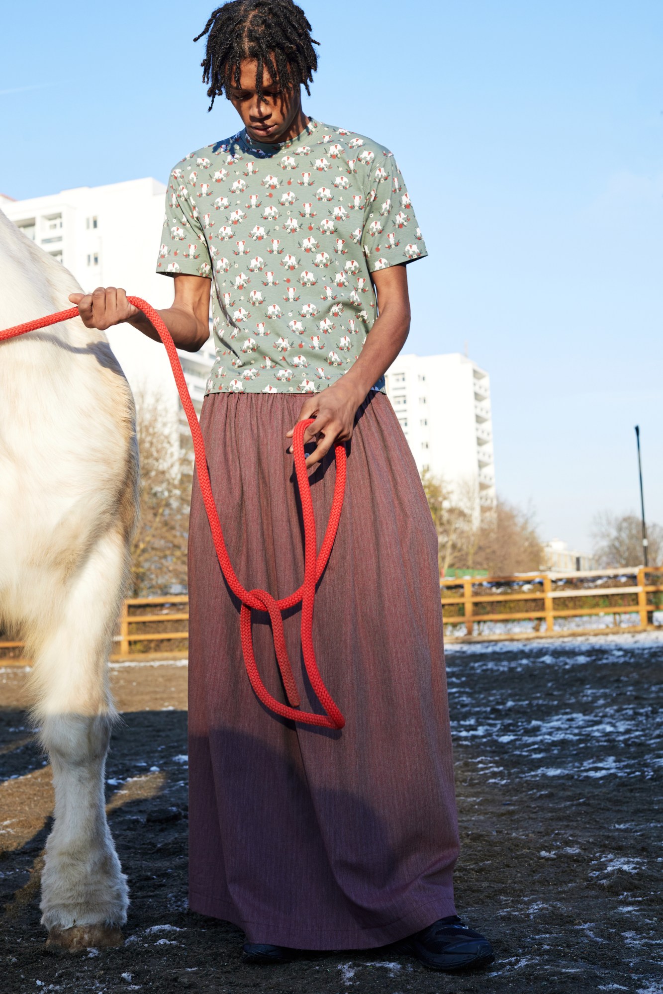 Formerly a model and now a freshly-minted CSM grad, designer Chloé Nardin launched her namesake menswear label for the SS22 season with a collection of buoyant, boyish menswear that would immediately establish her very singular design language. “I’m drawn to creating work that looks at pop and urban culture from a very tender perspective,” she says. “My garments are very relaxed and sporty, yet have this feel of the homemade theatre clothes your mom used to make.” Chloé trades in nostalgia, and that’s exactly what drew her to the Middle Ages for her sophomore offering. Titled Guts, the designer’s AW22 collection takes both its name and its conceptual cues from medieval-themed manga Berserk, which Chloé lovingly refers to as “a knight’s tale”. “I refer to childhood a lot in my work,” she says. “The ‘knight’s tale’ is a great theme as it touches on incredibly serious things like war, domination and power, yet is so charged with nostalgia — so pure in a sense.”