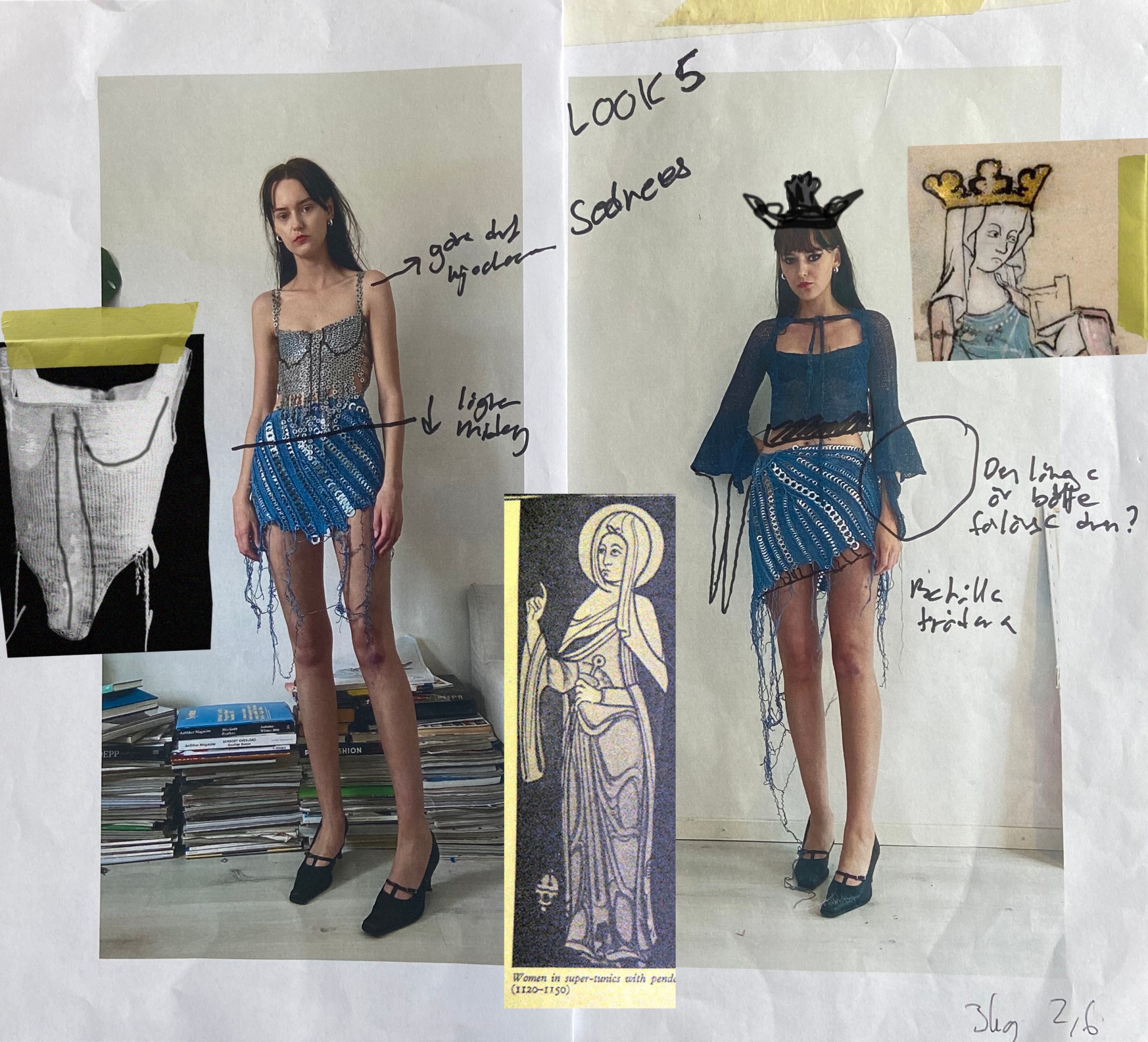 Mikaela approached the medieval with a similarly rosy vision. “My aesthetic has a foundation in a romanticised world but with an irate attitude,” says the knitwear designer and Swedish School of Textiles grad. “I’m fascinated by the figures of the princess, the angel and the fairy, but I also relate to evil characters like the witch and the devil. Really, it’s probably about the complexity of being human.” These kinds of storybook tropes are what initially drew the designer to the Middle Ages and, likely, what drew Caroline Polachek to Mikaela’s designs for her 2022 tour. “I’m interested in the dissimilarity between the escapist fantasy of knights and princesses in contrast to the awful realities of plague and famine,” says the designer. “There was a lot of misery during the Middle Ages.”