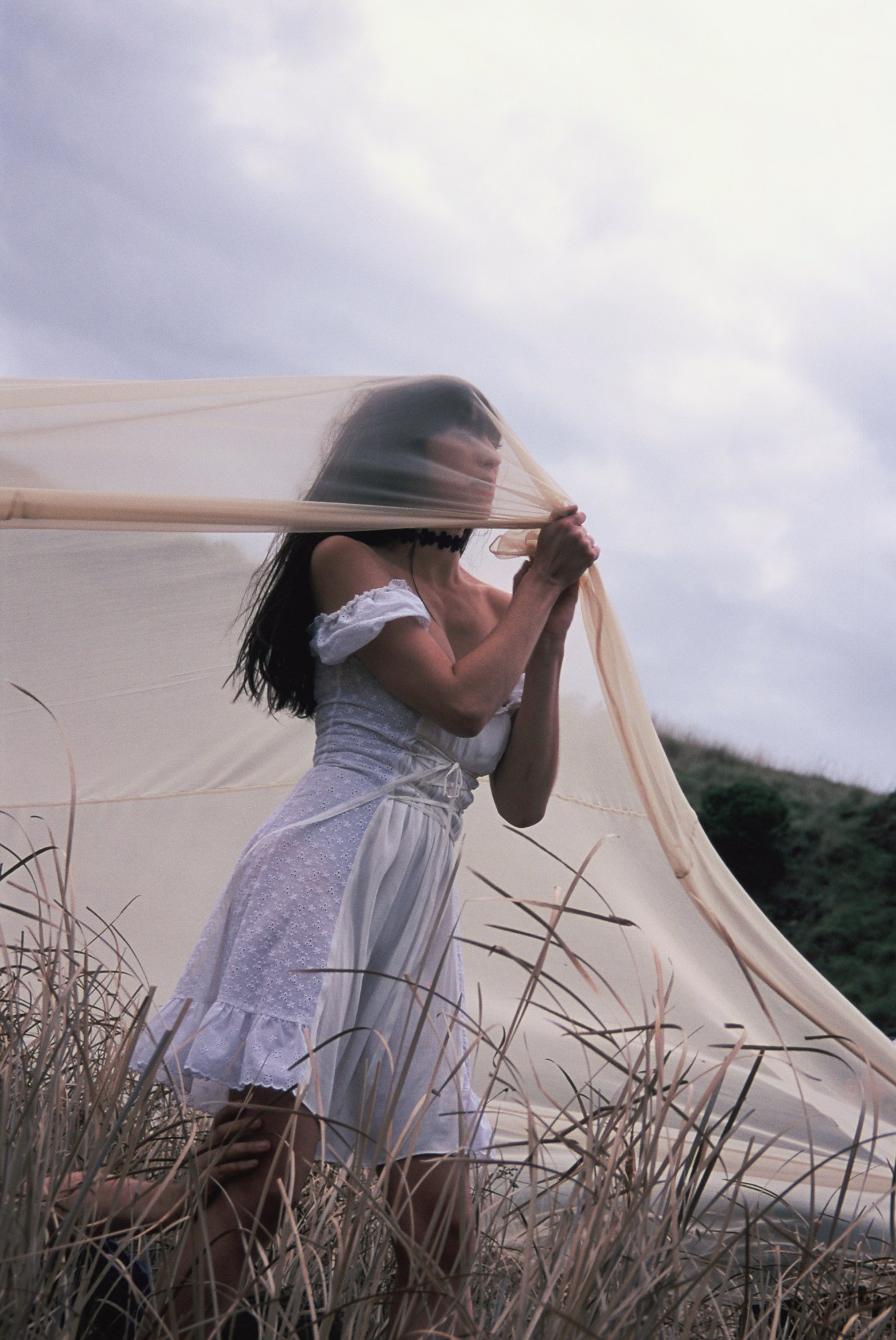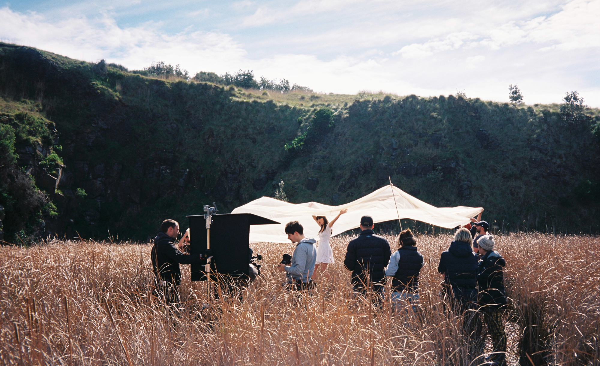 I’m in the middle of what might best be described as a heath: rolling hills, unkempt grass rippling in a Saturday afternoon breeze. Well, maybe more of a gust. The sun is being skittish. Kimbra stands surrounded by reeds in a Daisy dress and Blundstones, careful of the mud below. She’s wrestling with a mesh banner held above her by a half-dozen strong crew, singing the chorus of Everybody Knows over and over — everybody knows about what you do/everybody saw and told the truth. (The clip will be her first since 2014’s The Golden Echo). I try to imagine what kind of stamina it takes to do what she does. She arrived on set at 5AM and will stay until the sun sets, then do it all over again tomorrow and the day after that — another two clips for Primal Heart, her third album.