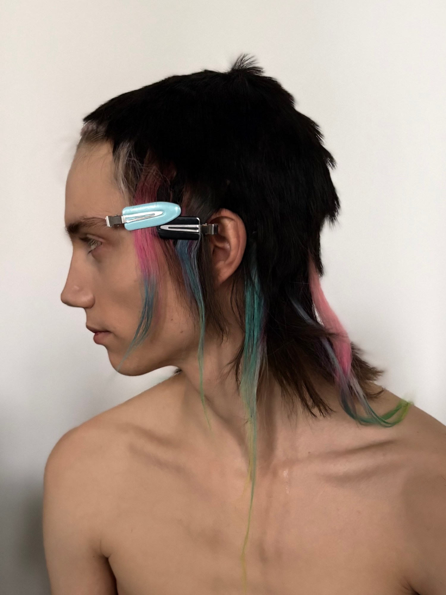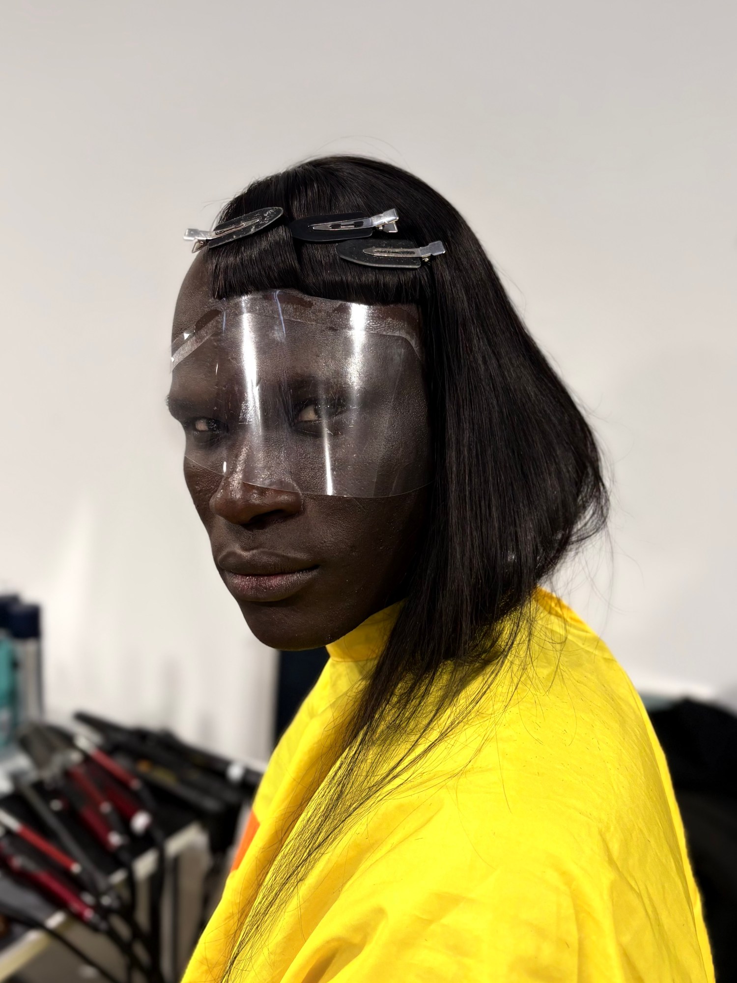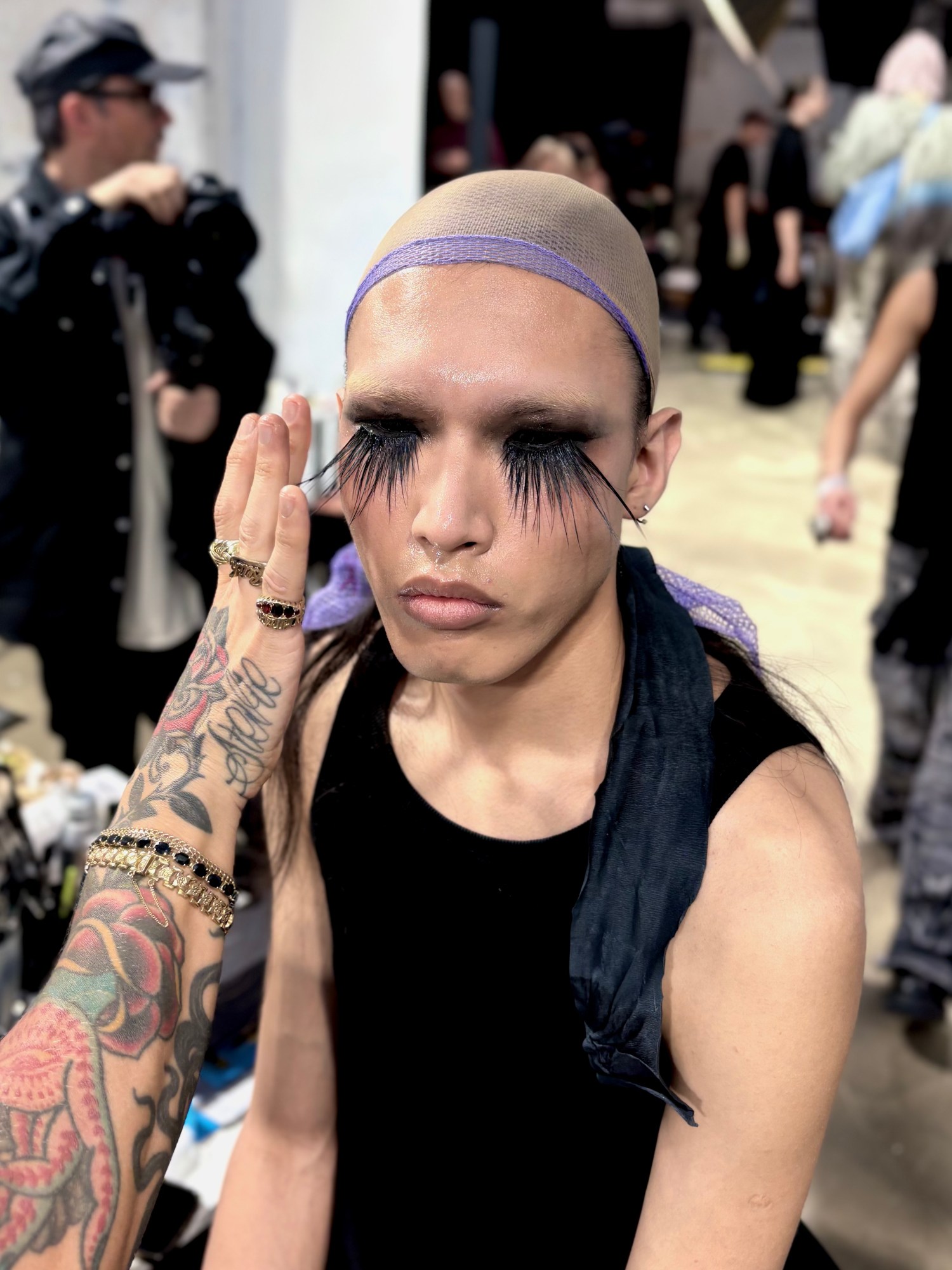 For the Rick Owens show, Martins’ digital faces stepped off-screen for the first time. His archive was used as a reference for the beauty team, hairstylist Duffy and makeup artist Daniel Sällström, who transposed the features of the artist’s imagined figures onto the models.