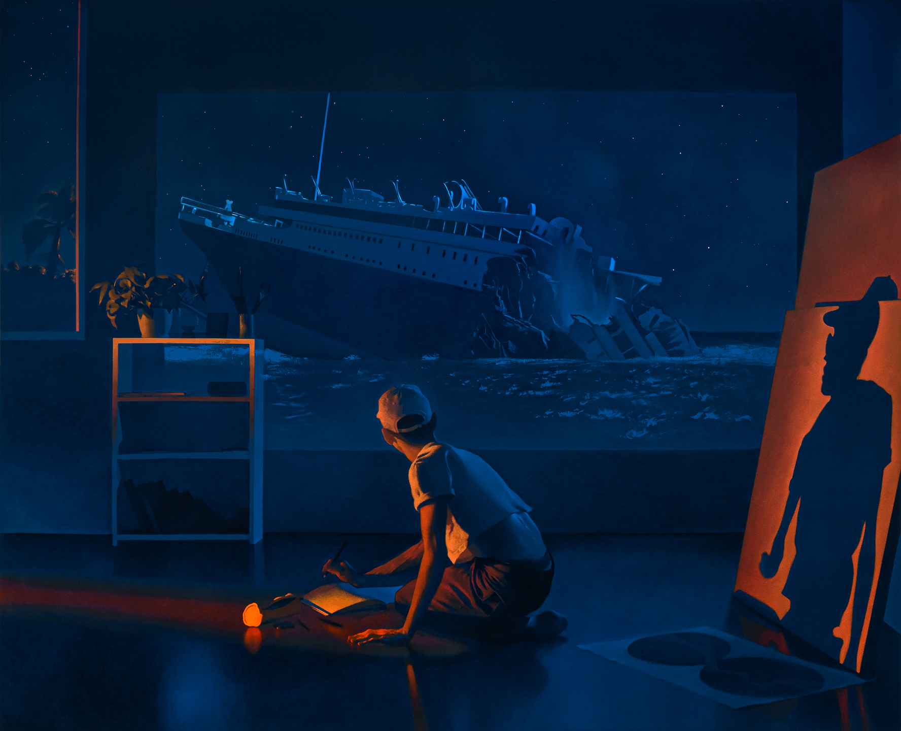 “Amanecer/Dawn” is a self-portrait that represents the awakening of my interest in creating art. The painting is primarily a nighttime image, but to the left, a small ray of morning light breaks through, as I, the model in the middle, am watching the sinking sequence from the movie Titanic (1997). The film struck me as a kid, especially because of the visuals of an event unfolding in the vast ocean against the backdrop of the horizon and the clear starry night. The paintings, such as “El Secreto / The Secret” and “Dime Lo Que Viste / Tell What You Saw”, are a representation of the mysterious aspect of the night, which further enhances the narrative of the paintings. The characters whisper things to each other, they notice mysterious lights in the sky or distant sounds. This is why the night is a theme I want to continue to touch on for much longer, to explore its possibilities and to connect paintings with each other.