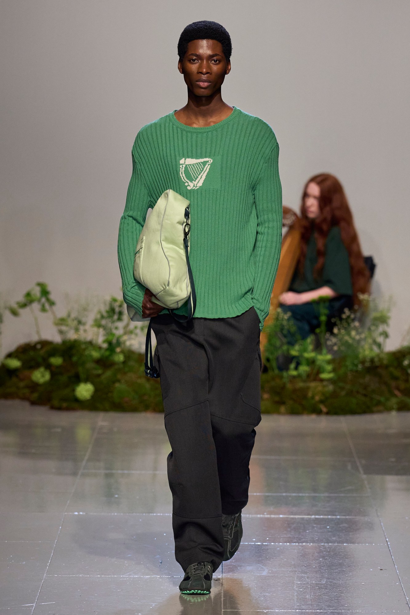 Robyn Lynch loves being Irish. As she should tbh! Being Irish is class! But what we know of as ‘being Irish’ has changed and modernised, and it’s that question: what it means (and looks like) to be Irish today, that the designer aimed to tackle with her AW23 collection. The answer was a gorpcore take on heritage that modernised without losing the playfulness that comes with the associations we have with ‘the Emerald Isle’. Unsurprisingly, there was a lot of green here. Pistachio green, lizard green, sage green, phthalo green. Green, sheep-covered fleeces. Green, O’Neills-inspired shorts, the kind you could expect to see on a wild Paul Mescal jogging through Hackney with a tinnie in each hand. Green holdalls big enough to carry the whole team’s hurling gear (and camogie too). And balaclavas! If the models looked like they would be as much at home trekking across the Mournes (toasty and warmly) than walking the catwalk in Old Selfridges Hotel, then that was intentional: Robyn’s collection was a celebration not just of Irishness but of Merino wool, a fabric that’s been central to her creative process since her AW19 debut with Fashion East. It makes sense! Ireland is cold! The materials reflect the rainy inspiration, with a focus on Merino as a fully biodegradable, uniquely versatile source. Merino jacquard jumpers callback to 19th Century Irish ceili dances, while ocean waste-recycled Seaqual nylons, all custom dyed (guess which colour) brought the collection back into the 21st century. The soundtrack, as much as the clothes, were a celebration of what it means to be an Irish woman today, and Robyn’s take on the trope of the “strong Irishwoman”. Emerging musician Róisín Berkeley framed the runway, performing a custom track for the occasion on her own harp. For the finale, the models emerged walking fast – Irish people walk fast! – to Sinead O’Connor’s Mandinka. Hup the Robyn Lynch boys. RL