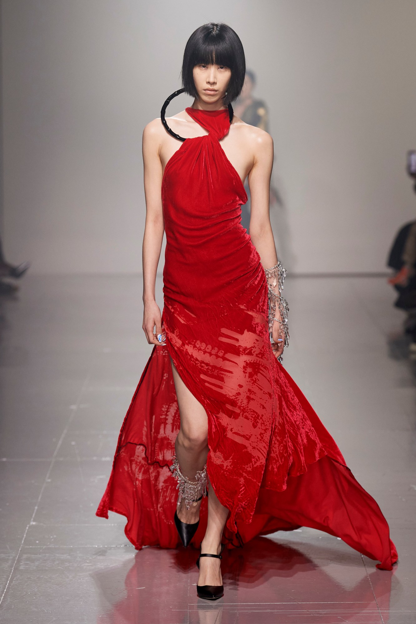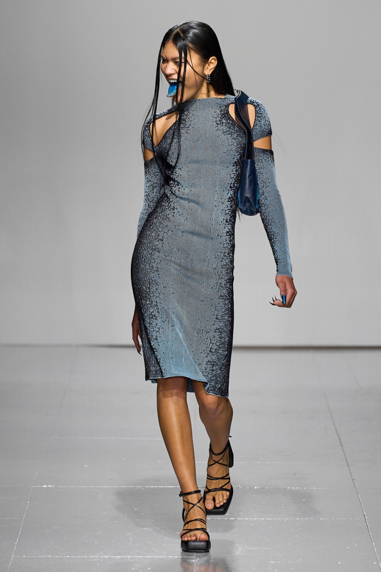 “It’s been a constant push and pull between trying to find my place in the industry. At a time when the world was going through so much chaos, I was seeking calm,” shares A Sai Ta, who hasn’t shown a collection for his label Asai since AW19. “When all of my other pillars fell down, fashion became the pillar that pushed me forward and could really ground me, where I can put all my energy into. I want to work from calm, not chaos. I have my intentions. I want to dream bigger.” Bigger was what we got for his runway return and the designer went full circle, opening the show with a red twisted halter dress with an off-centre ring around the model’s neck that paid homage to the opening look of his first Fashion East collection, an era that cemented him as one of London’s most exciting designers. Dangling from the models’ arm and leg, too, were drapings of crystals inspired by the chandeliers of Danh Võ. Knotted shaggy threads were patched into frayed gowns or piled into a haystack of a head-piece over a puffy pussy bow dress sheeted with a thin layer of gold. His sexy and deeply coveted ‘hot wok’ overlocked pieces became even sexier across one-shoulder garments, lacing up legs and distressed to reveal as much skin as possible. Distressed denim was everywhere too, making barely-there tiger print gowns, thigh-high boots fallen to the heel and ribbons of strands dangling to the floor from a corset. Weaponry continued to be a theme for Asai, with nunchucks holding leather across model’s chests and shocking leather spiked ball and chain bags. “Can you take my breath away?” asked the show notes. Asai, at least, has proven four years on that he can still take away ours. TG