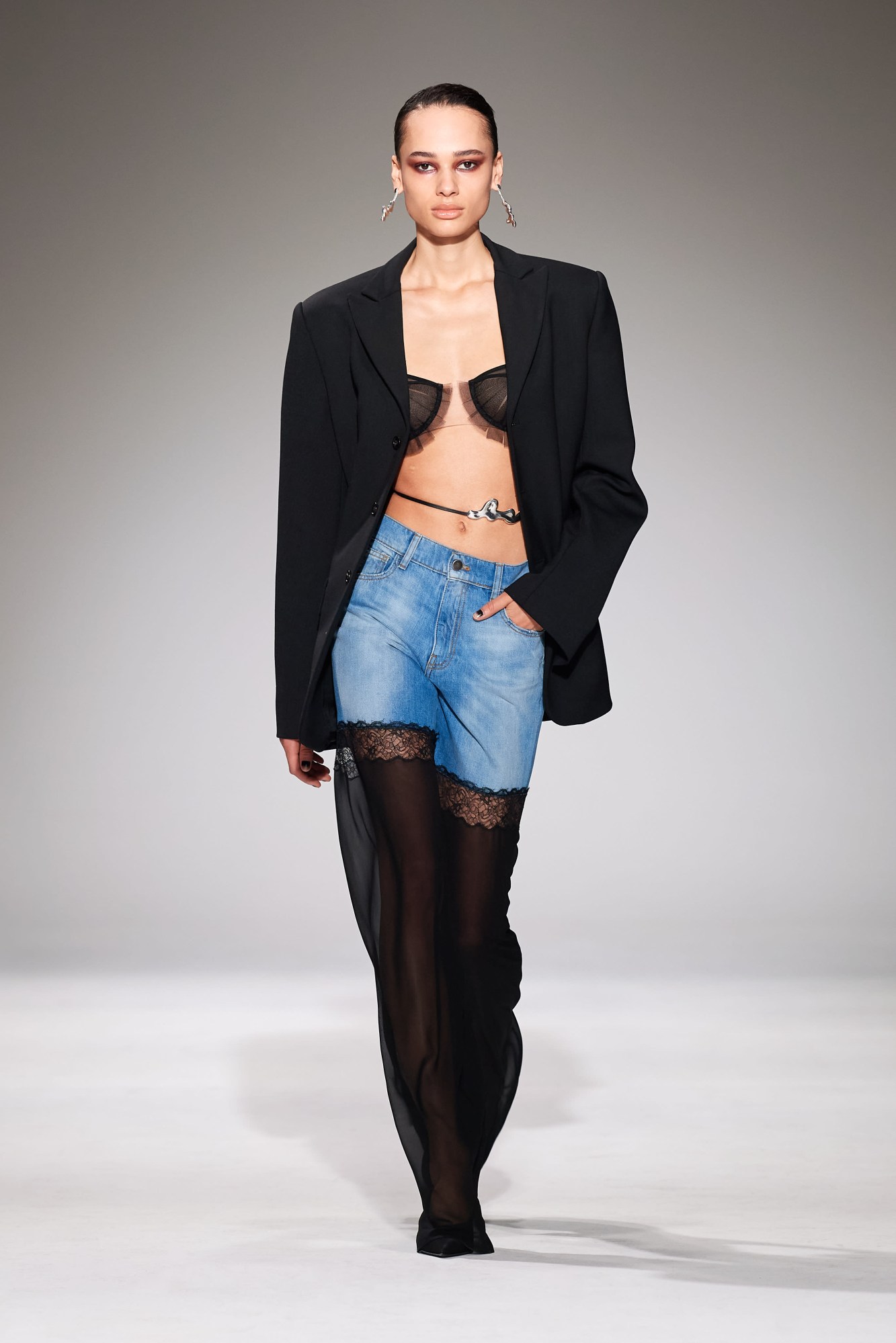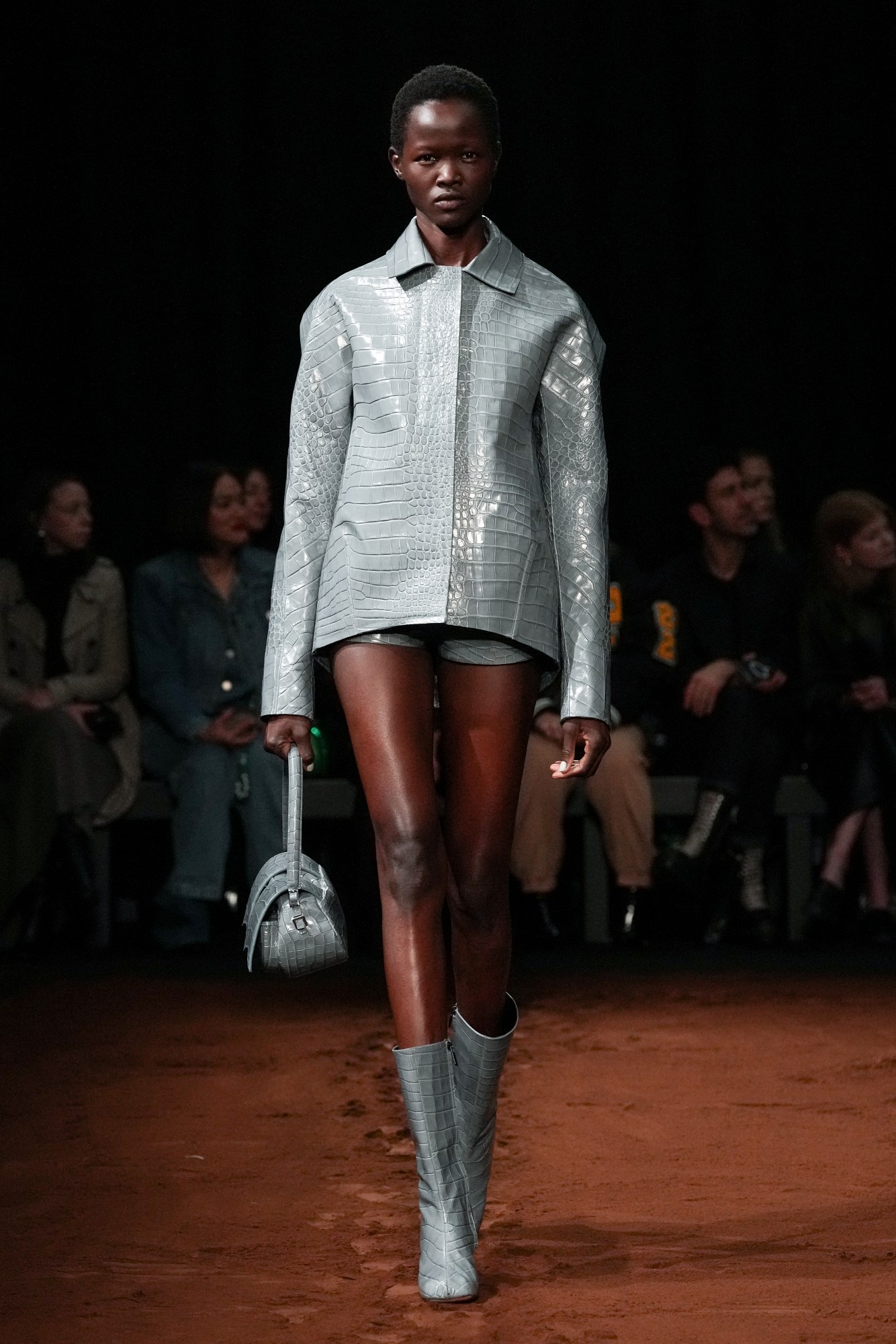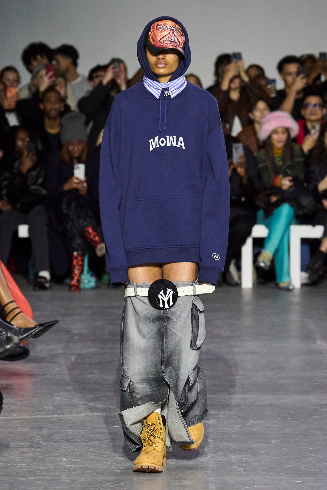 If there’s anyone who could pack a show in London to the rafters at 10pm, it’s Mowalola, and last night that’s just what she did. Showing her first full collection in the city since her Fashion East days, the designer fielded a red-pilled (in the OG Matrix, rather than the contemporary political sense) collection that explored our tumultuous relationships with technology — how we’ve basically become slaves to the algorithm, and businesses that build them. Such apocalyptic ground is, of course, natural territory for Mowa — who, back at the beginning of the pandemic, expressed her dismay at how boring the reality of what seemed like the end of the world actually was — but for all the collection’s nihilistic thematic undercurrents, this was perhaps one of the designer’s most accomplished bodies of work to date. Set against a backdrop of bootleg copies of New York’s cultural iconography (where better, after all, to situate the collection than global capitalism’s beating heart), hefty denim and columnar silhouettes in black ponyskin — often featuring face coverings and reverse-wraparound bug-eyed sunglasses — converted a sense of sinister, at-times fetishistic, corporate flair. Louch hoodies and biro-scrawled leather bombers suggested a dissident hacker-ish spirit — a generation of feisty rebels challenging the status quo, of which Mowalola is certainly a part. The cherry on top, though, was the abundant return of the designer’s hyped leatherwork, longline macintosh coats featuring trompe l’oeil body prints, skirts cut to look like they were caught falling down about the knees, bandeau tops and skirts, and trousers with windowpane cutouts. After all, if the end of the world is nigh, you at least want to look hot when it comes! MS