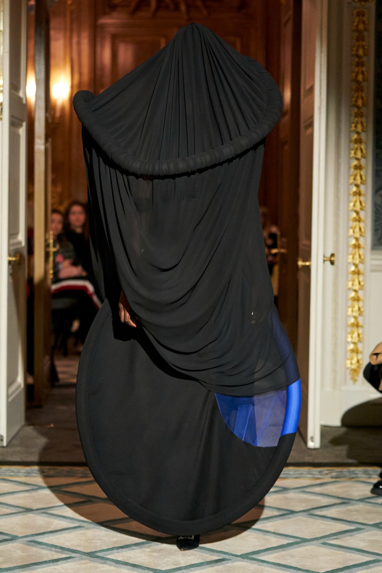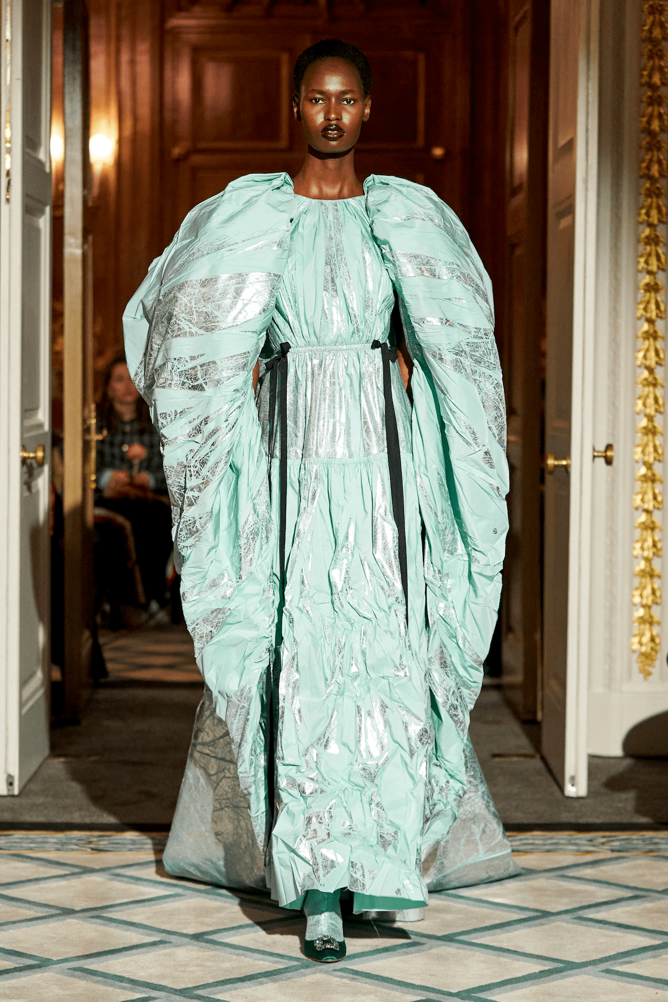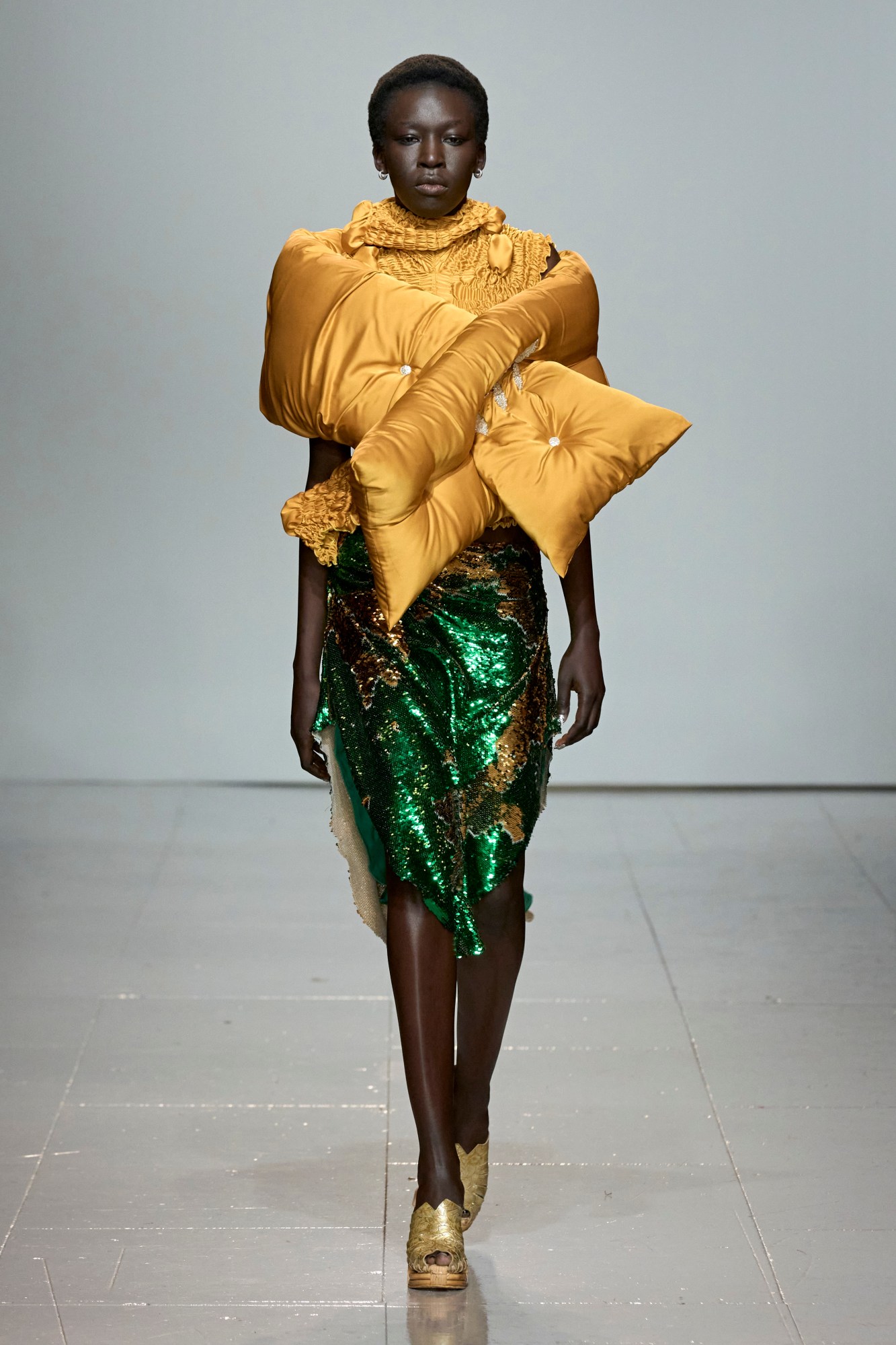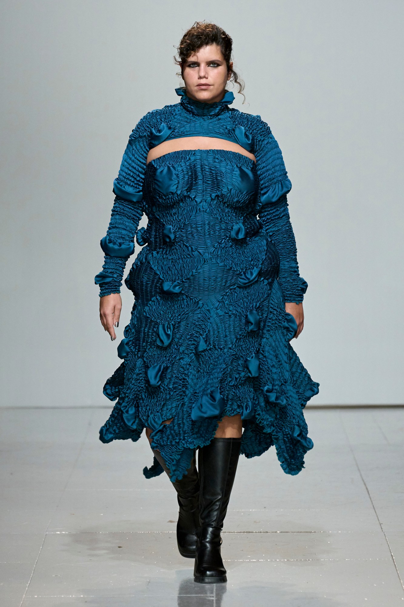 What was clear was that Christopher was toying with the unexpected, once again looking to his own biography as a wellspring of references to be elevated into high-concept sartorial experiments. Ruffled bustles on skirts resembled fastened bin bags, placed at the front and backs of streamlined tailoring and pencil skirts. “They were meant to be intestines at the front, unravelling, and then it became an intestine bustle,” Christopher added. “Then it was almost like waddle, like duck waddle, waddling along like a black swan, an ugly duckling.” His mission is to create a wardrobe that feels slightly disturbing, perverse even,“for those who desire clothes that challenge sartorial tastes and standards,” as he put it. Here, the mundane and banal was elevated into something intellectual and beautiful. Make no mistake: these are interesting clothes for interesting women, and more importantly, a celebration of working-class Britain at a time of widening disparity between social classes. “Life is beautiful for some more than others,” a voice on the soundtrack repeated, along with the sound of a purring cat. Christopher’s collection made it clear that there is beauty to be found in the everyday life of so many working-class people in this country, which is a beautiful idea in and of itself. OA