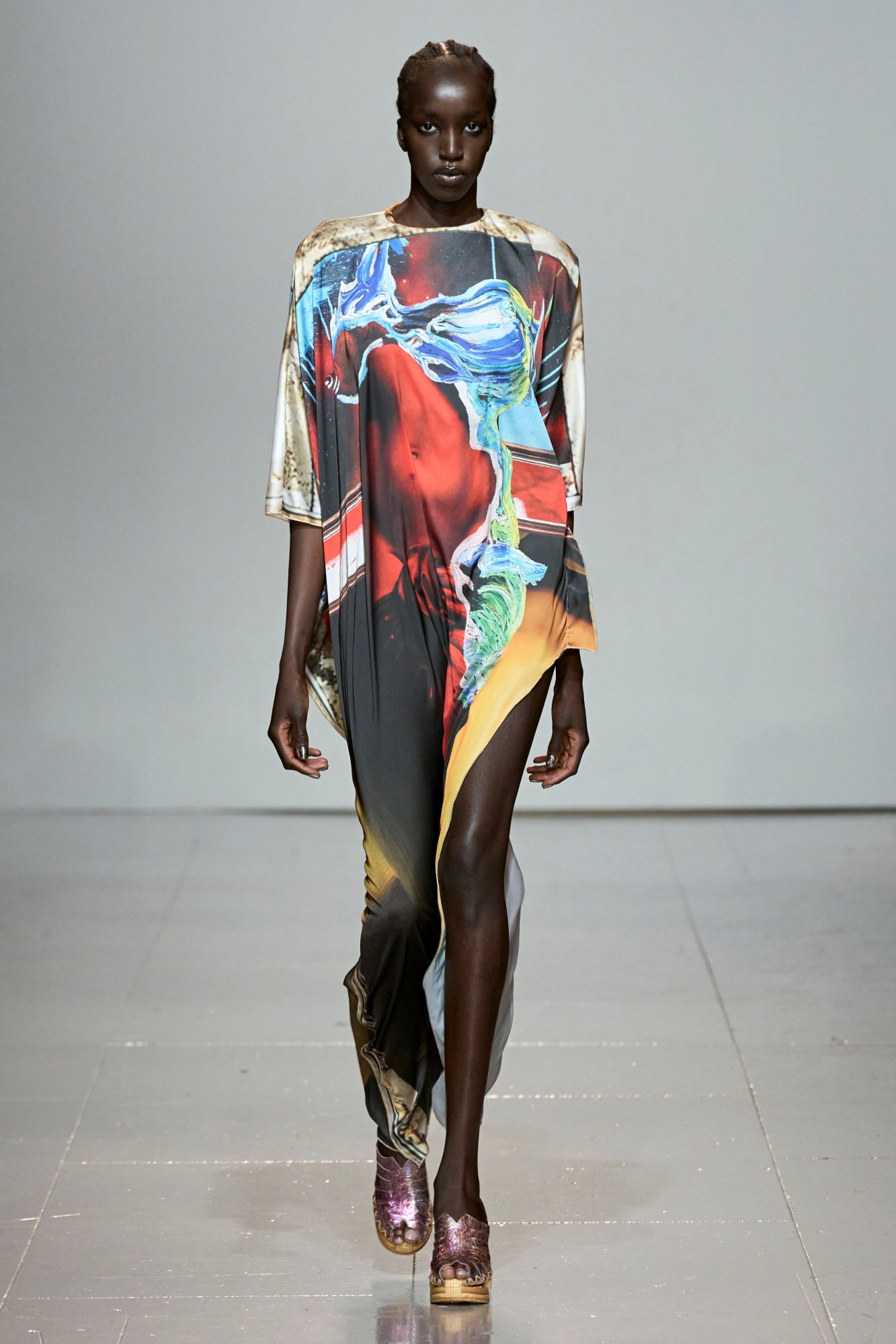 Talia Byre, we presume, loves a girlfailure. So fittingly, the Liverpudlian designer’s AW23 was a celebration of womanhood in all its gory glory. Models stomped around the intimate setting of Borough’s Lant Street Wines, they followed in the footsteps of the leading women who went before them. Inspired by the women of The Graduate and Funny Girl, the technicolour influence of the 1960s flooded the collection, from screen-printed leopard motifs on wool and cashmere separates, to form fitting maxi dresses in onyx black cherry brown, red tights and chalky lilac poplin blouses. “Who said that life’s all about conformity and wedding bells?” Talia’s show notes asked us. Her AW23 collection was testament to that; this was a celebration of the female anti-hero, a character that’s awful and unrepentant for their awfulness. The carefree, colour-clashing – an ode to American painter Helen Frankenthaler’s colour palette and pioneering work, Jacob’s Ladder – and the fearlessness of each piece was the designer delivering a proverbial middle finger to the expectations that come with tradition. For the finale No Doubt’s seminal angry-girl classic Just A Girl blasted from the speakers, but it could just have easily have been Taylor Swift. These are, after all, clothes for women who don’t mind saying: it’s me, hi, I’m the problem, it’s me. RL