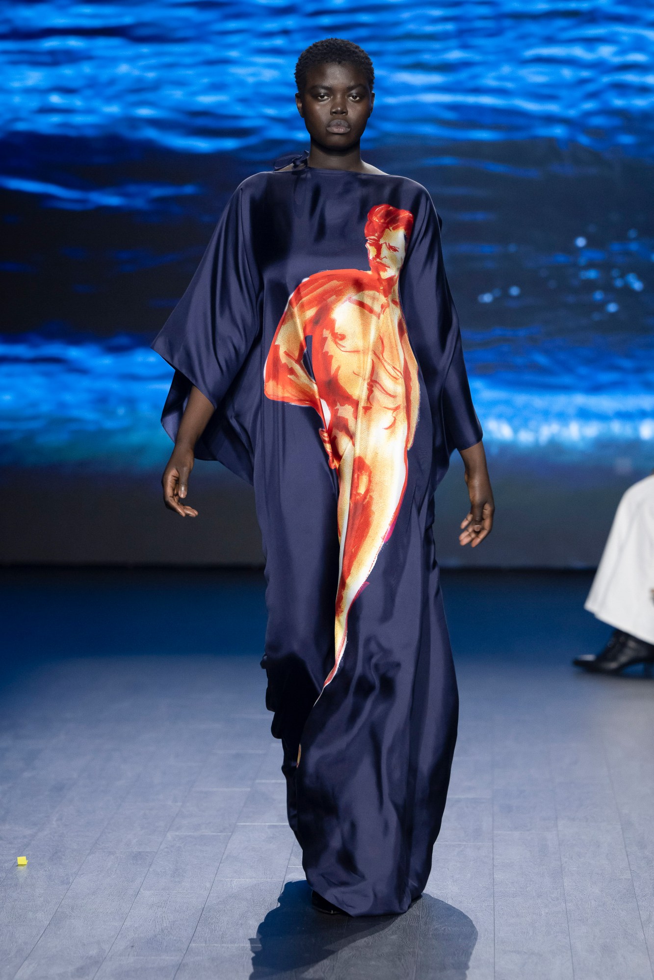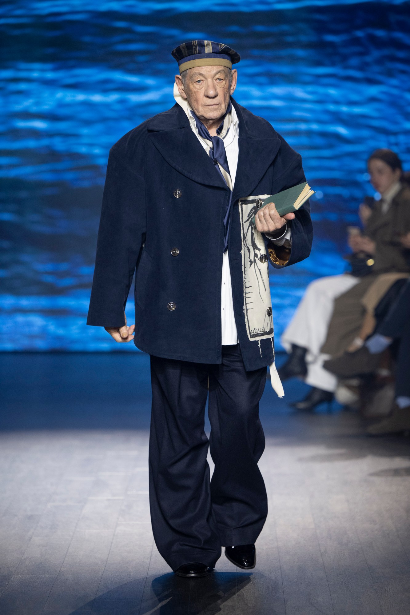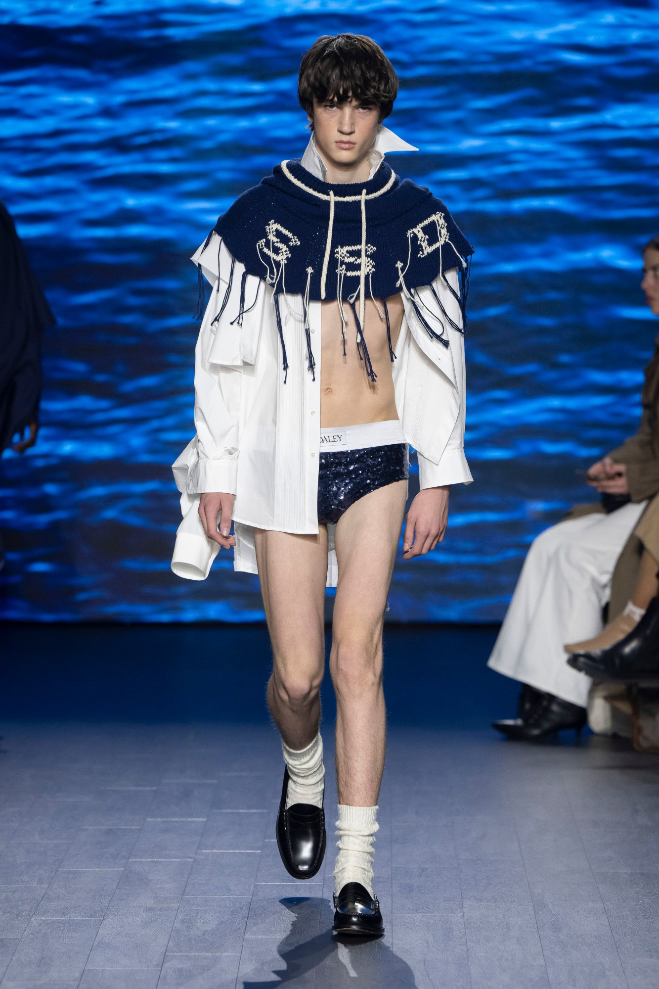 Opening the show was Sir Ian McKellen, reciting the aforementioned Tennyson poem wearing a navy peacoat with a drawing of a male lover attached, literally kept close to his body while out at sea, along with matching wide-leg trousers and a silk sailor’s hat and scarf. The queer vibes continued across sequined briefs and boxer shorts paired with shredded knits with dangling threads, as if the model’s clothes had disintegrated under the sun stranded on an island; shirting and gowns decorated with orange-toned male pin-ups like a gender-swapped version of the popular tattoos; and frilly shorts belted by ship bunting. There were still some of the usual S.S. Daley signatures here, too – singlets with tied-key-hole detailing and knits with cutouts, stunning animal prints embedded or quotes from the inspirations of the show – but there was also an expansion into technical clothing with a gold and blue striped cagoule with an asymmetrical zip and silk lining, as well as lieutenant pocketed cargo pants, both with cute rope tie detailing. Steven may be on a winning streak right now, but this collection showed he was still ready to traverse, and even conquer, new waters. TG