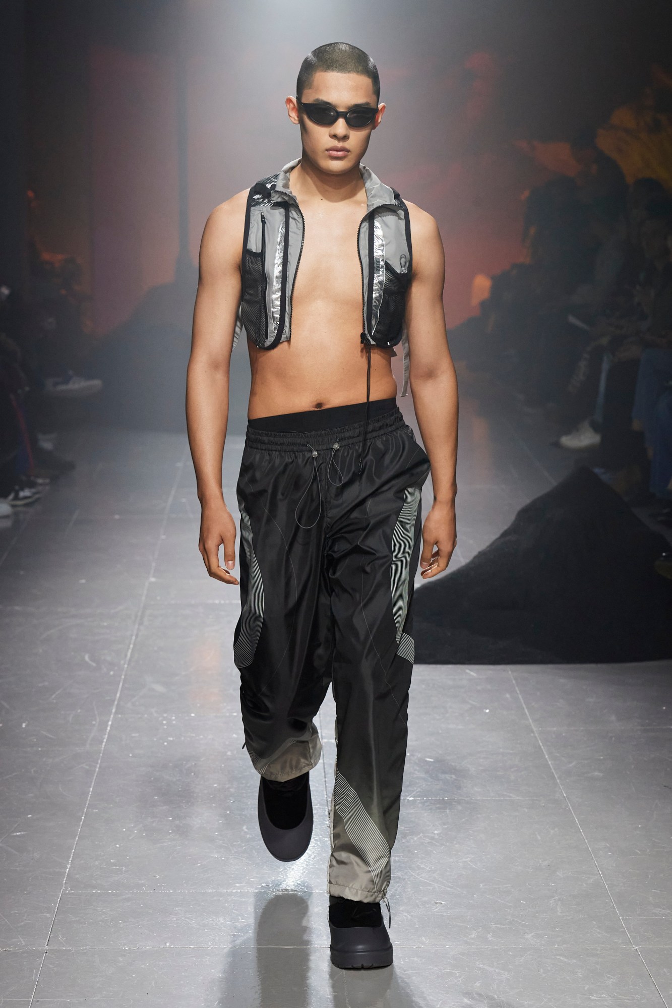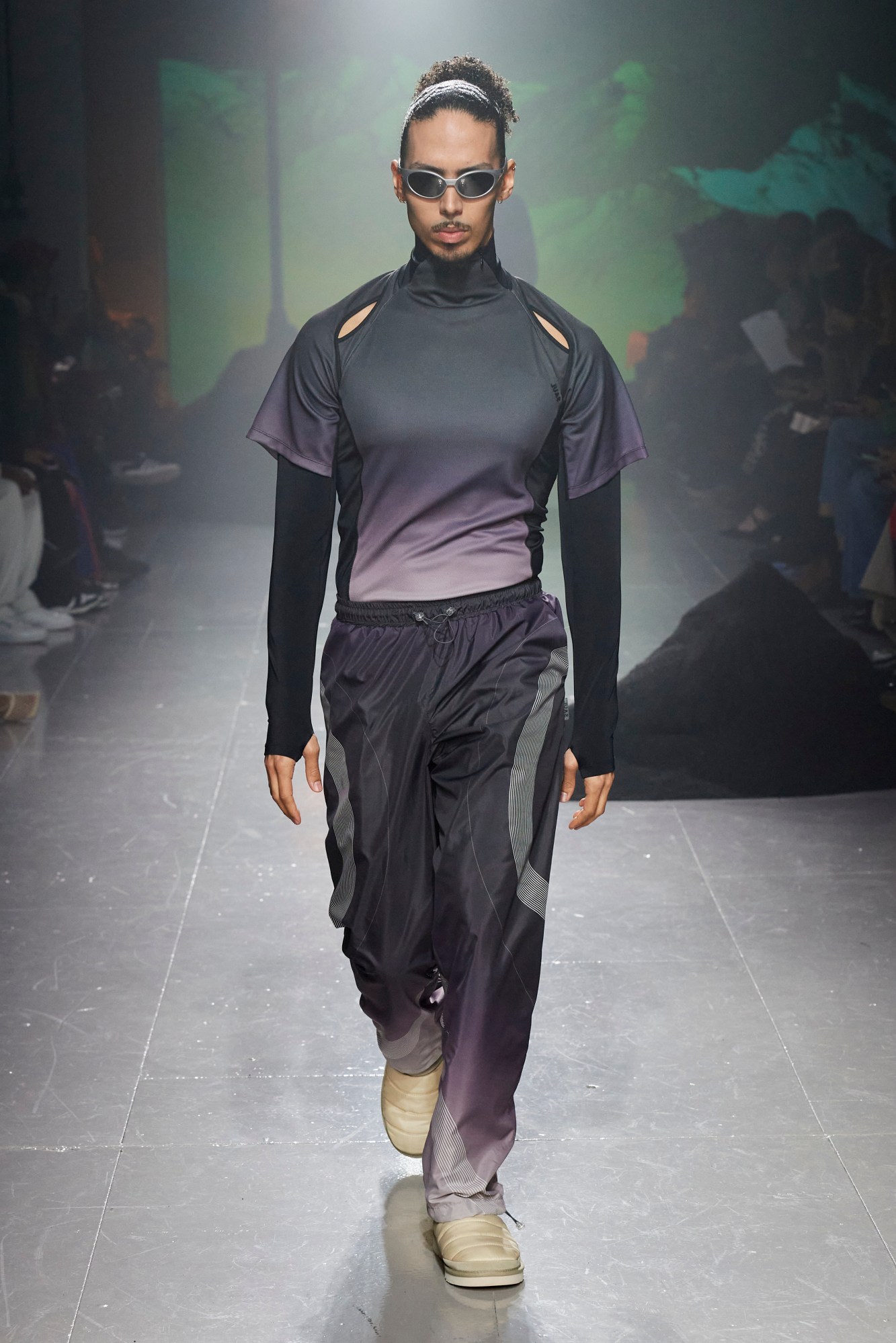 The world might be slowly getting hotter, but Saul Nash is convinced that AW23 at least, is going to be chilly. Models shivered, rubbing their hands together, blowing into their palms to keep warm in the designer’s elegant, elevated take on activewear. This was skiwear via Zone 1 rather than Verbier, though, which makes sense, given the Londoner behind the collection. “When you grow up in London, you wear a lot of ski outerwear, but you never learn to ski”, Saul explains (see also: groups of fintech workers in Soho wearing identical Canada Goose jackets in balmy early October). “It’s a symbol of aspiration that’s juxtaposed with the realities of everyday living.” That ‘Juxtaposition’ was at the heart of this collection from the 2022 International Woolmark Prize winner (and the name of it too). These were technical pieces, functional but beautiful, tailored but casual. The presentation played into the idea of opposites too, with models in Merino knit sweaters with cleverly aerated ventilation, padded down coats with kinetic lines, soft cocooning gilets with zip off sleeves and the presence of a tailored jacket. Streetlamps dotted the runway as these models danced around each other artfully, as though this was the black run on Val d’Isère rather than central London. Padded Uggs and wrap around Oakleys completed the apres-ski effect, the burnt orange and hot red lining of the cleverly draped pieces, inspired by volcanic mountain ashes, further bringing the outside in. It’s almost enough to make you yearn for colder days and dark nights and wish spring would never come. Well, almost. RL
