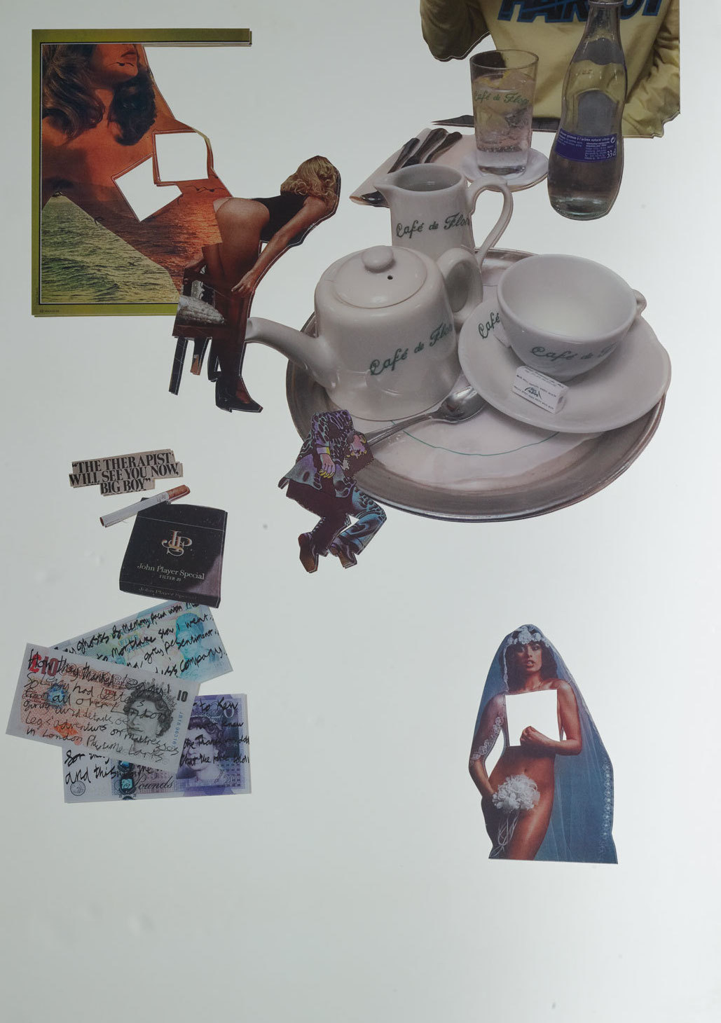 From here the still-only-19-year-old has created a new series of works that range from collaged works pasted onto mirrors, to massive prints made on canvas. The works circle around classic Blondey motifs; vintage smut, scribbled on bank notes, and clippings from tabloids. There’s even a nod to Blondey’s favourite pub, The Cross Keys in Covent Garden, as he’s turned his till receipts from behind the bar into works.