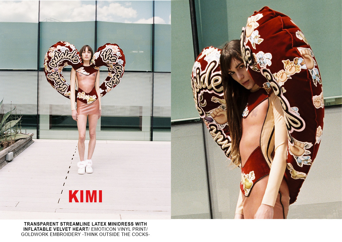 Graduating from the Royal College of Art earlier this year with a witty collection comprised of blow-up hearts, anacondas and crowns, phallic chainmail and My Little Pony frills, Nan Li and Emilia Pfohl aka Namilia were the ones that stuck in everyone’s minds, and the first picture to pop up when searching for the show reviews. The zine they’ve made explaining their collection is a sugar-coated collage of stickers, emojis, hashtags and your fair share of celebrity activists, that deconstructs female stereotypes and buries their negative connotations. With Miley setting up her Happy Hippies Foundation, Ariana shutting down anyone who refers to her as “Big Sean’s ex” and Nicki Minaj/Kim Kardashian/Rihanna/Beyoncé redefining stick thin body stereotypes, there are plenty of celebs to choose from if you’re looking for a modern feminist idol. These are the women Nan and Emilia looked towards for their final collection.