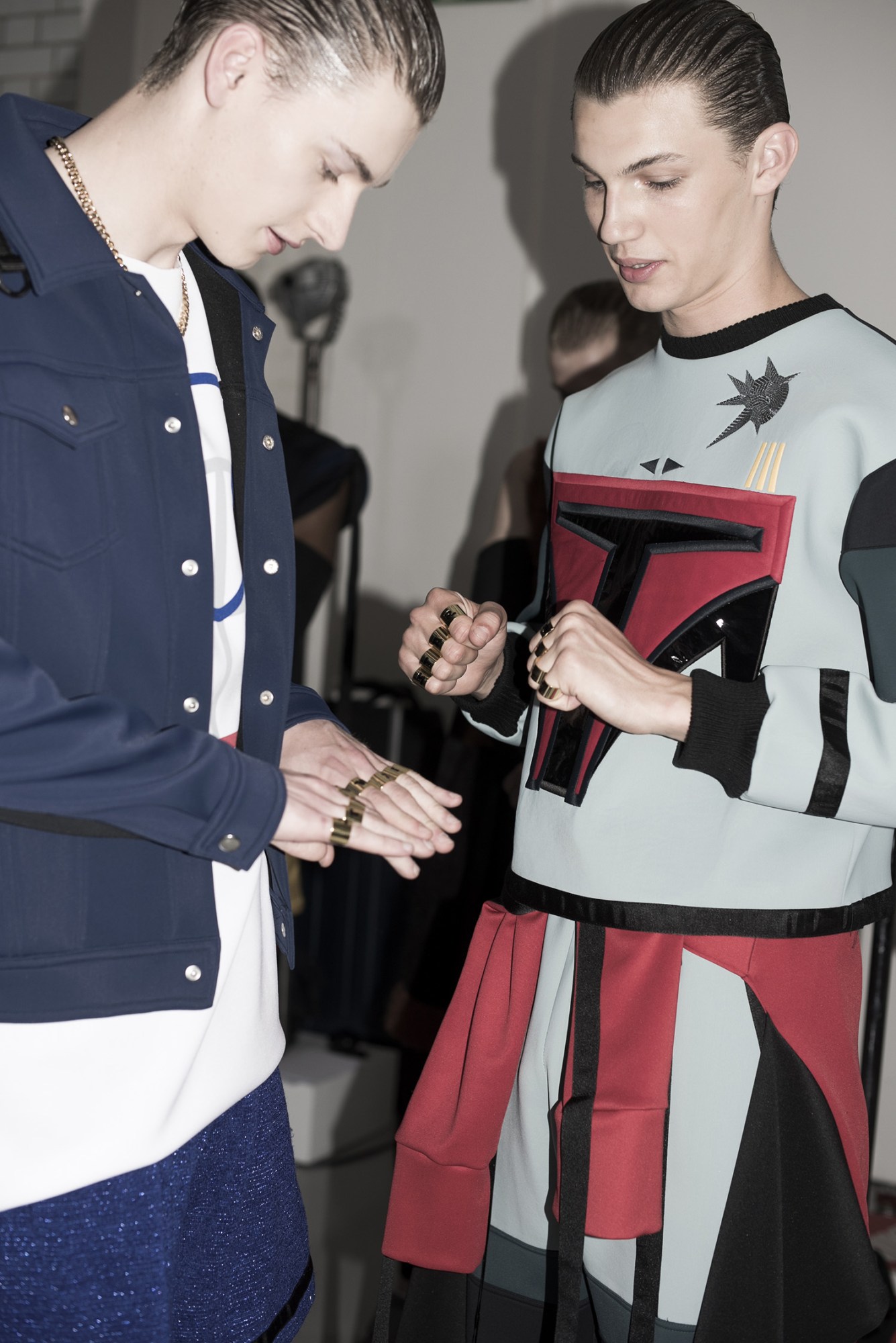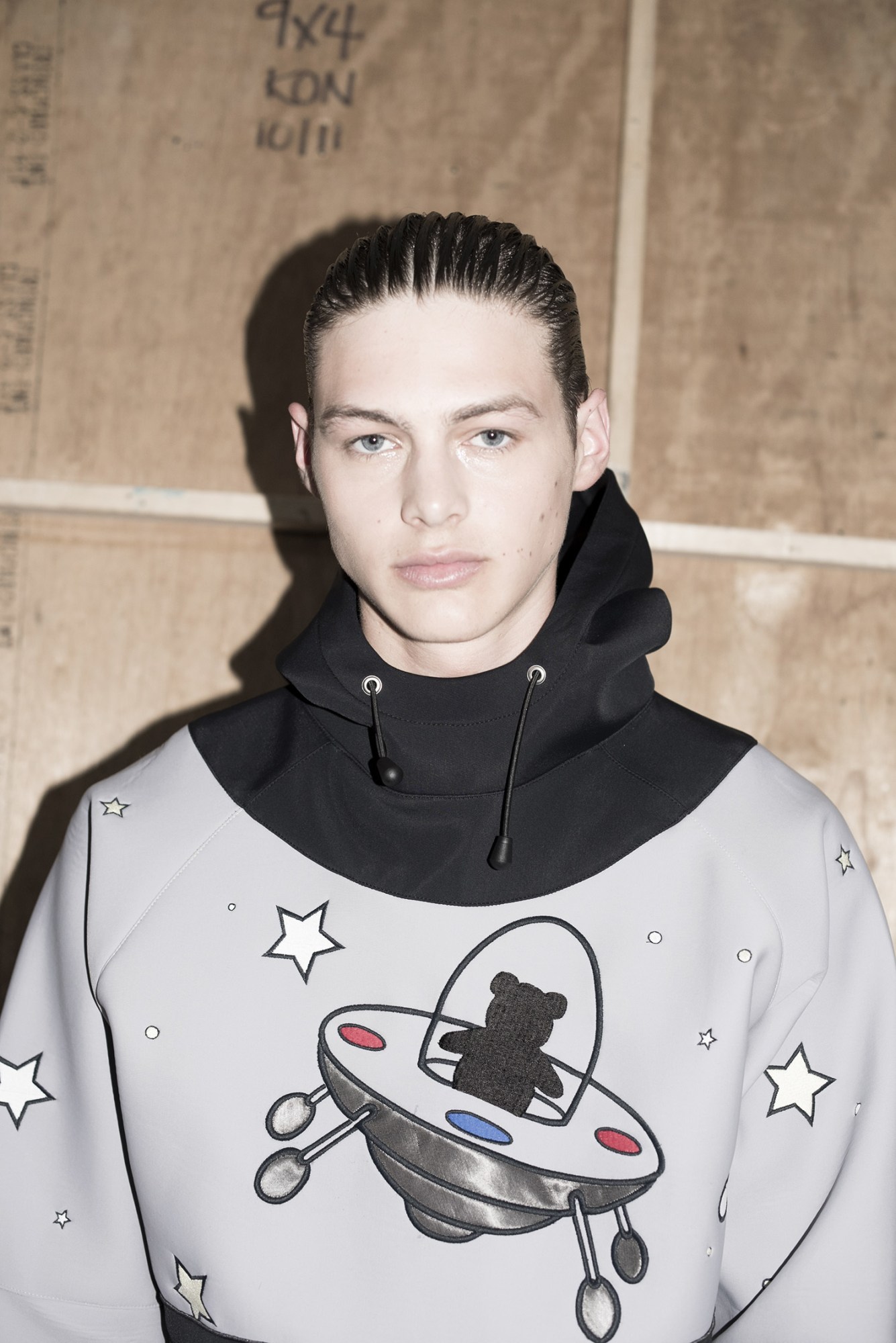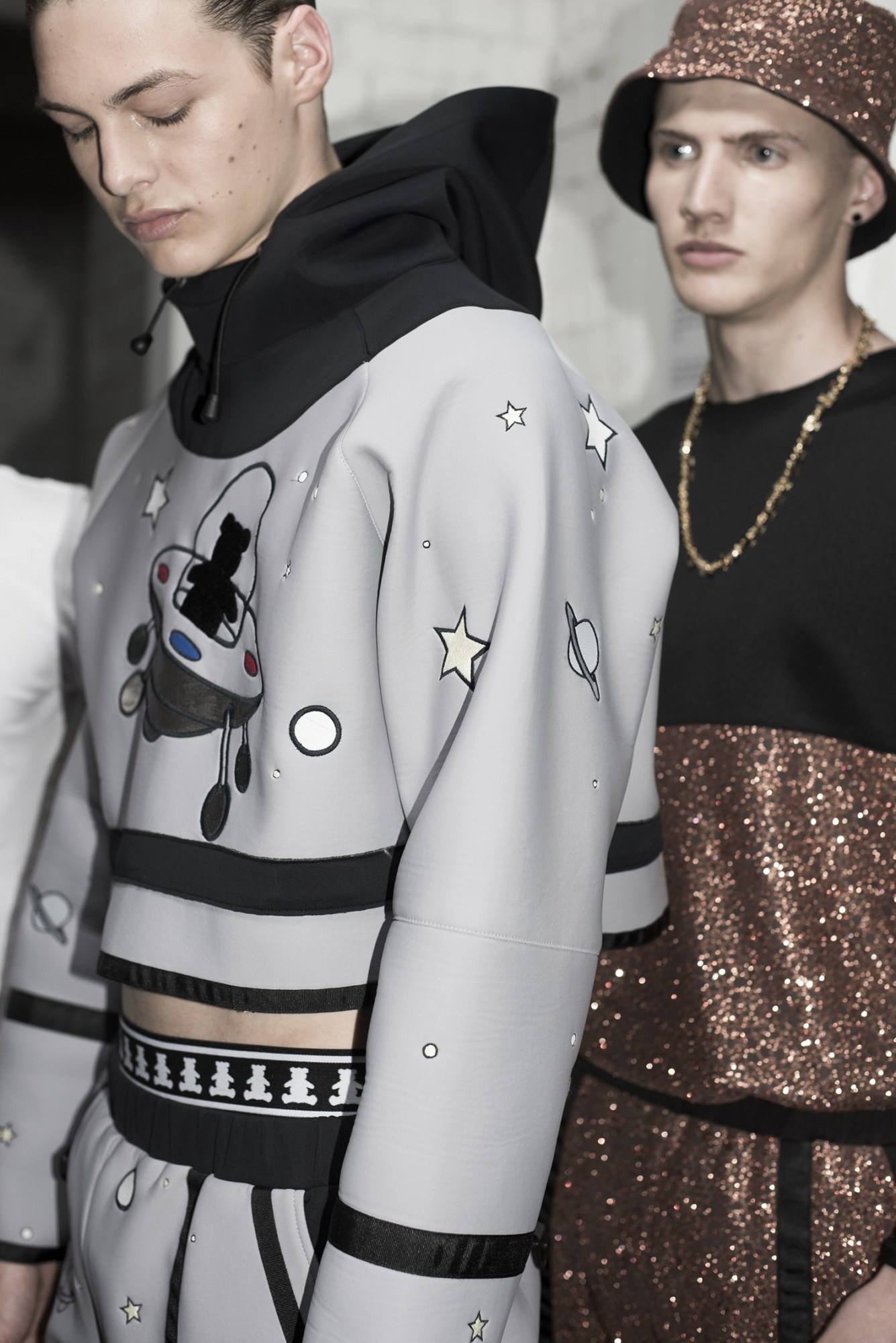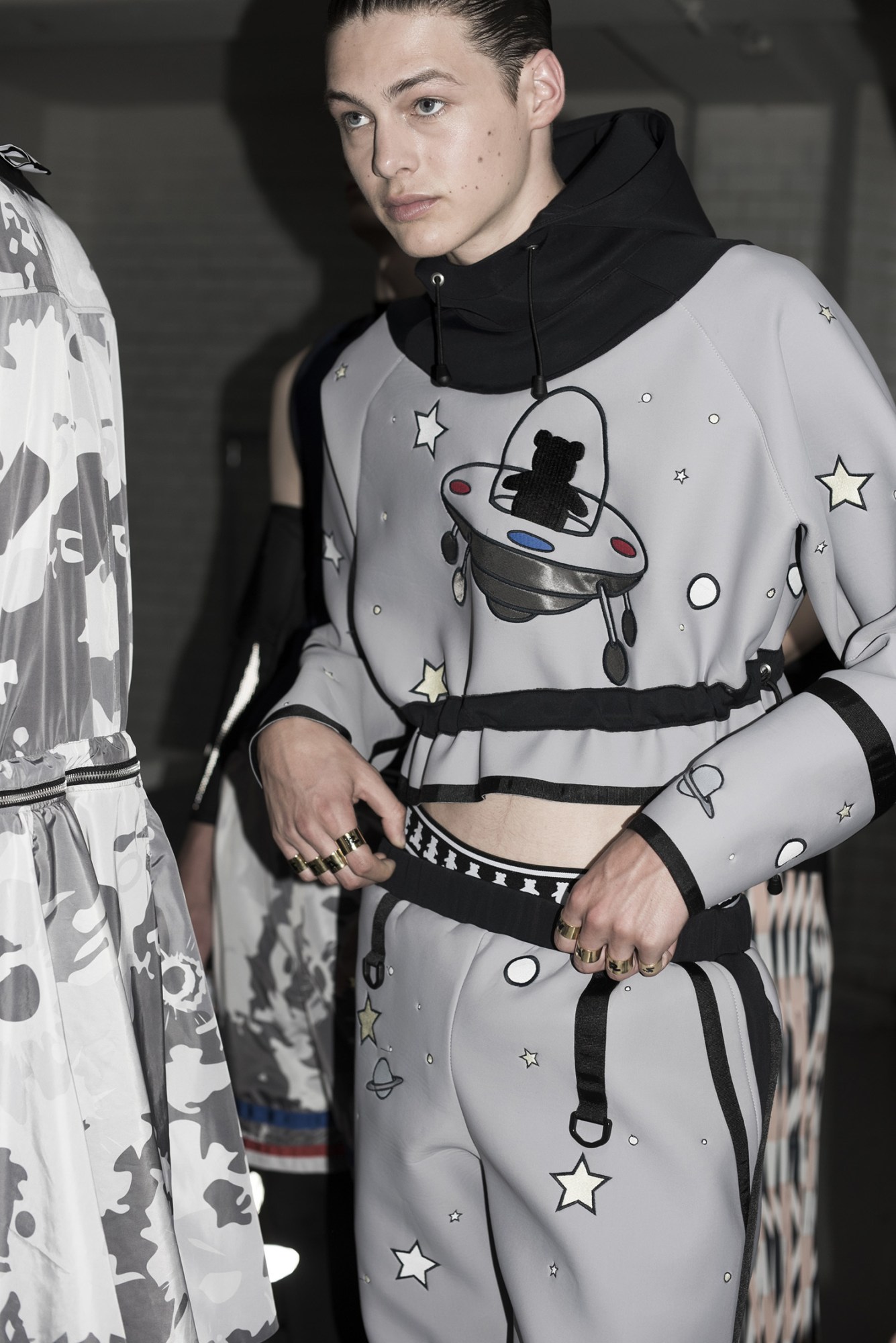 “I feel good, it’s nice to be back,” Bobby Abley beams backstage. Taking us back to the future and deep into his starry eyed imagination, Bobby marked his solo catwalk debut by reimagining his first intergalactic Fashion East installation, Astro-Abley. Mixing the retro sci-fi components of The Jetsons and Astro Boy with his copy, pasted and manipulated take on Star Wars, he demonstrated his warp speed progression from fun-packed talent to growing brand.